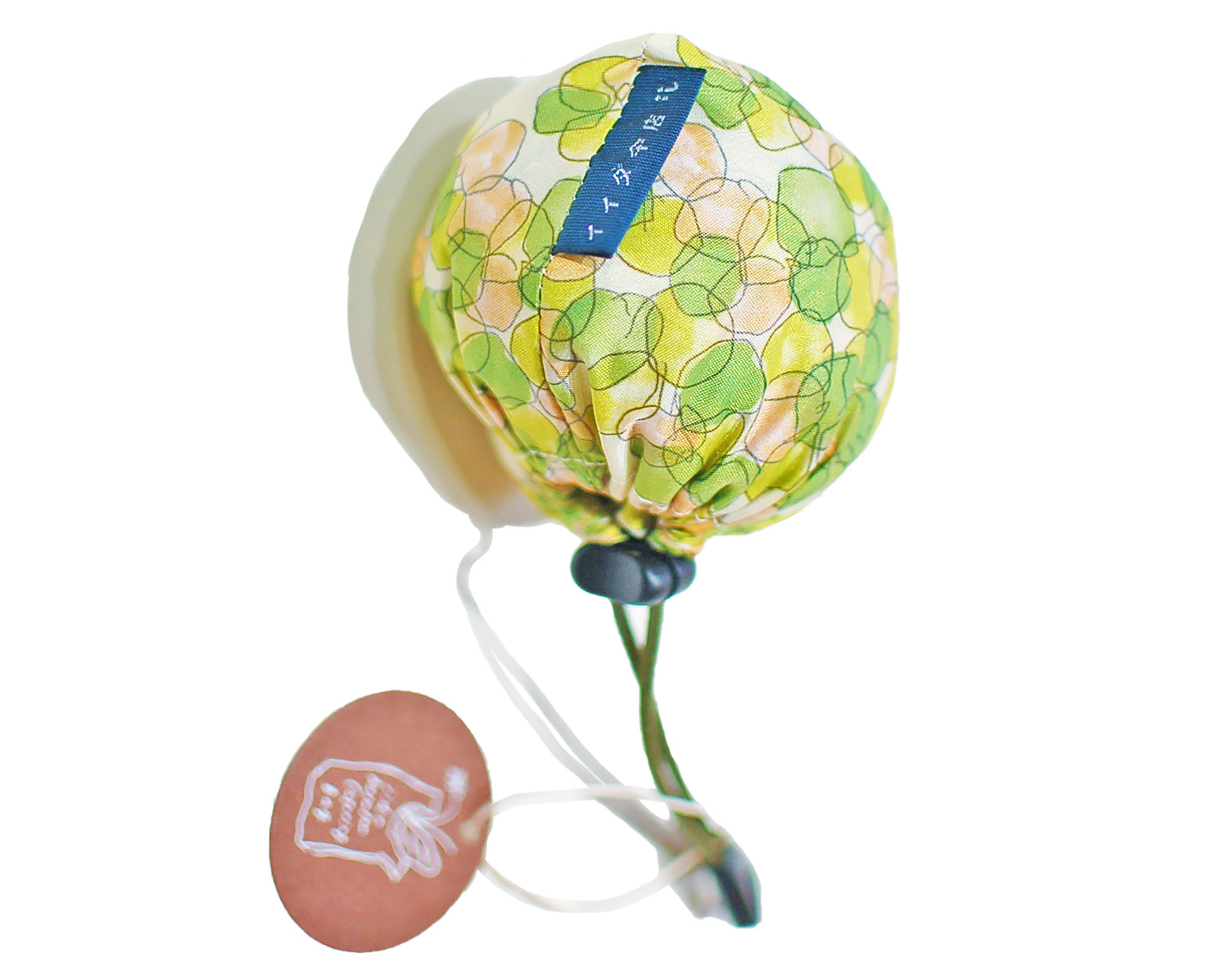2021年の新作「キンモクセイ」の雨の日トートバック。イイダ傘店の代表作のひとつ「押花」。くしゅくしゅっと小さく丸くなる、お買い物にいい「こもれび」のエコバック。