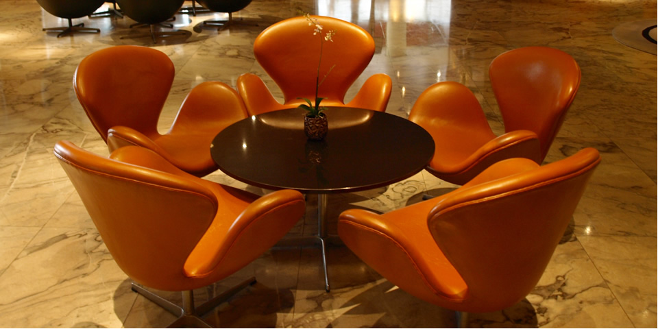 広いエントランスに入ると、革張りのエッグチェア(The Egg)とスワンチェア(The Swan)がお出迎え。大理石の床と美しい曲線を描くらせん階段。想像以上にエレガントなロビー。チェックインは、ポール・ヘニングセンのPHランプの下のデスクで。受付の女性スタッフは黒服をビシッと決め、長いブロンドの髪を一つに束ねた北欧美人。気品があるけれど気さくな感じで、日本語で「コンニチワ」と微笑んでくれました。こちらも「Hej!(ハイ!)」とデンマーク語で挨拶。「アリガトウ」には「Tak!(タック!)」。この片言のやりとりが楽しい。そして、彼女が「ナイスビュー」と話してくれた13階のルームへGo!