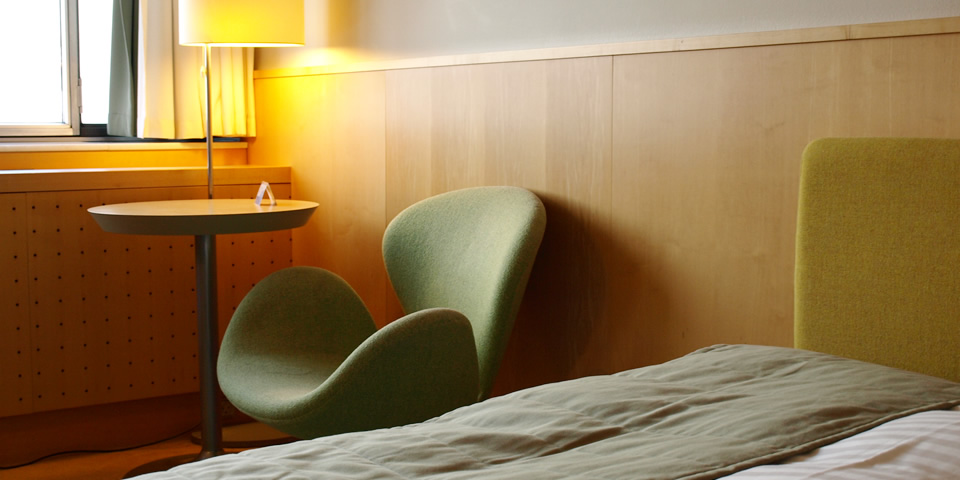 13階に到着し、部屋のドアをあけると、メープルの木目の壁やインテリアの中に……いました! スワンチェアが! リーフグリーンの白鳥が羽を広げて、「ようこそ!」と部屋に招いてくれます。