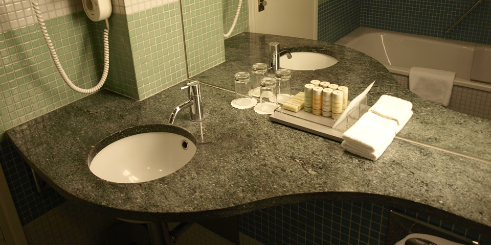 パステル調のグリーンのタイルがやさしいバスルーム。北欧のホテルではめずらしく、お風呂がついていて湯船でゆったりできます。洗面台は高級感あふれる大理石。冬に冷たくなる床は、なんと大理石の床暖房です! 部屋の内装やインテリア、照明のコードのスイッチまでデザインしたというヤコブセンですが、水道の蛇口にもこだわっています。シンプルな中にも高いデザイン性感じる美しいプロポーションの蛇口……ただ、使いやすさはクエスチョン??? 小さなレバーがうまくひねれず、シャワーのお湯が調整できません! でもこれも、歴史あるホテルの楽しさのひとつ。帰国した今は、あの言うことをきかないわがままな蛇口がかわいくてたまりません。