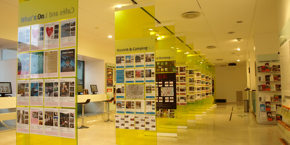 旅先で見つけたパンフレットやフライヤーを帰ってからも大事にしまっておく自分のようなタイプには、コペンの観光案内所(ワンダフル・コペンハーゲン・ツーリスト・インフォメーション)はたまりません! デザインの優れた、かっこいいパンフレットはまさにアート。ここはアートギャラリーといってもいいほど、良質のDTPデザインがあふれています。空間レイアウトもすばらしく、観光スポットやレストランなどを紹介するクリアボードのライムグリーンが、世界中から訪れるさまざま国の人々を、明るく、あたたかく迎え入れてくれます。ここに来れば、不安な旅のはじまりが、たちまちわくわくするものに変わるでしょう。さすがはデザインの国。日本にもこういうおもてなしのある観光案内所があればいいのに。PCも置いてあるので、インターネットで検索もできます。ネットが自由に使えない海外の環境では、すごくありがたいサービス。