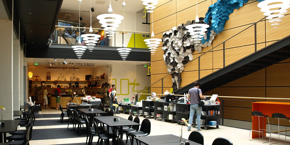 1Fのショップとカフェが併設された吹き抜けのロビーには、モノトーンのインテリア。天井からは、光の輪が幾重にも重なったようなペンダントライト、ルイス・ポールセンのエニグマが! 日本人の照明デザイナー内山章一さんの作品です。照明家具デザインの王国デンマークで、日本人が光を放っているのが誇らしかったです。