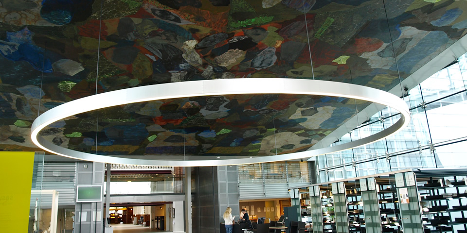 新館と旧館をつなぐブリッジ。入口の油絵のようなタッチの天井画が印象的です。この渡り廊下には、バイキングの帆船の模型が展示されていたり、カモメがたくさん飛んでいたり、航海の歴史がつづられていました。館内では、現代アートのエキシビジョンも行われているそうです。ミュージアムのように楽しめる王立図書館は、観光にもおすすめ。現代から中世へタイムトリップするようなブリッジを抜けると、1906年に建設されたレンガ造りの旧館が。琥珀色に染まるクラシカルな内観がたまりません。