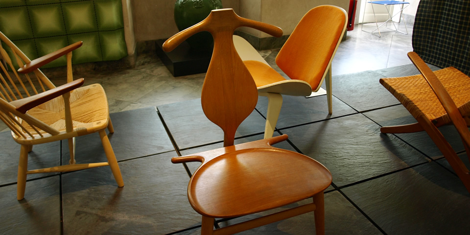 写真は、デンマーク国王が買い上げたといわれるヴァレットチェア(Valet Chair)。背もたれがハンガーに。座を手前に引き起こすとズボン掛けに。さらに、座の下の三角形のボックスは小物入れに使える、ユニークな椅子。