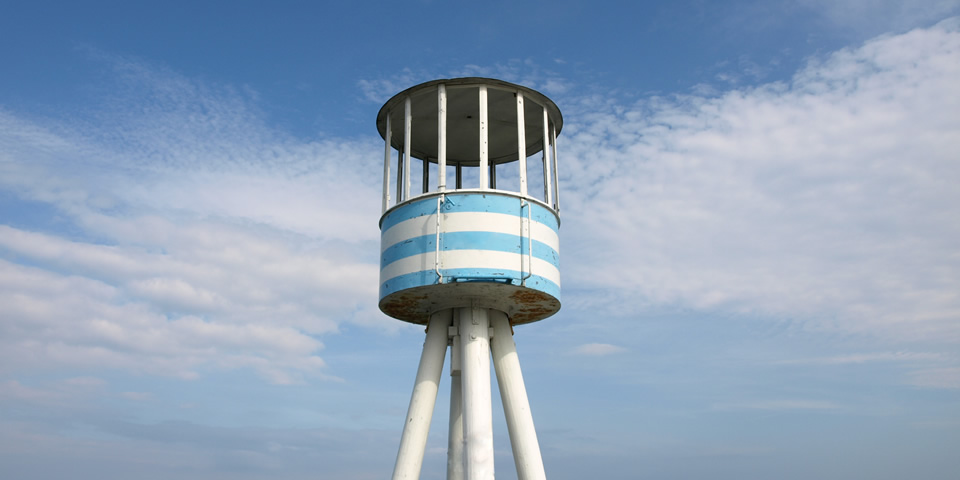 ヤコブセンがデザインしたベルビュー・ビーチ(Bellevue beach)の監視塔。ライトブルーの3本ラインがかわいい。コペンハーゲン中央駅(København H)から郊外列車Re に乗って約20分(エストー(S-tog)は約30分)。クランペンボー(Klampenborg)駅を降りるとすぐ、白い砂浜と青い海が広がってくる。日本のビーチで例えるなら、沖縄ではなく湘南由比ケ浜。リゾートビーチではなくて、みんなの海水浴場といった感じ。ヤコブセンの監視塔は思ったよりも小さくて、サビや落書きがあったけれど、なんかなごむ。初めてなのに、なつかしい感じがするのはなぜ? 子供から老人まで愛されるビーチ、愛されるデザイン。グッドデザインはいつも、ナチュラルに景色の中に溶け込んでいます。