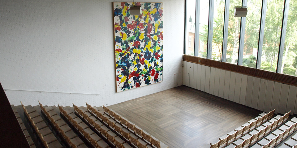 写真はカフェのとなりにあるコンサートホール。ステージの壁にかけられた花がらのアートパネルが素敵。ここで音楽会や発表会をしたら、どんなに気持ちいいことだろう。きっと、窓の外の景色と自然光が、味わいある舞台を演出してくれるはず。
