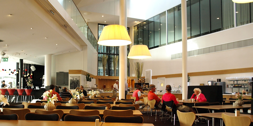 1Fレストランの吹き抜けの3角ゾーンは、ビュッフェスペースになっていて、朝食のパン、チーズ、ヨーグルト、サラダ、フルーツが、これまた色鮮やかにセンス良く並んでいます。大きな胚芽パンや全粒粉パンは、パンきりナイフで好きなだけカット。こっちのパンは小麦粉が違うのか、はごたえと弾力があってたまりません!ヨーグルトも濃厚でなめらか。ドライフルーツやミューズリーをのせておかわり。野菜もフルーツも、どれも新鮮で本当においしい! はまったのが、スウェーデン伝統の乾燥パン「クネッケ」。固いクラッカーで、ジャムやチーズを乗せて食べます。あのパリパリはクセになる◎