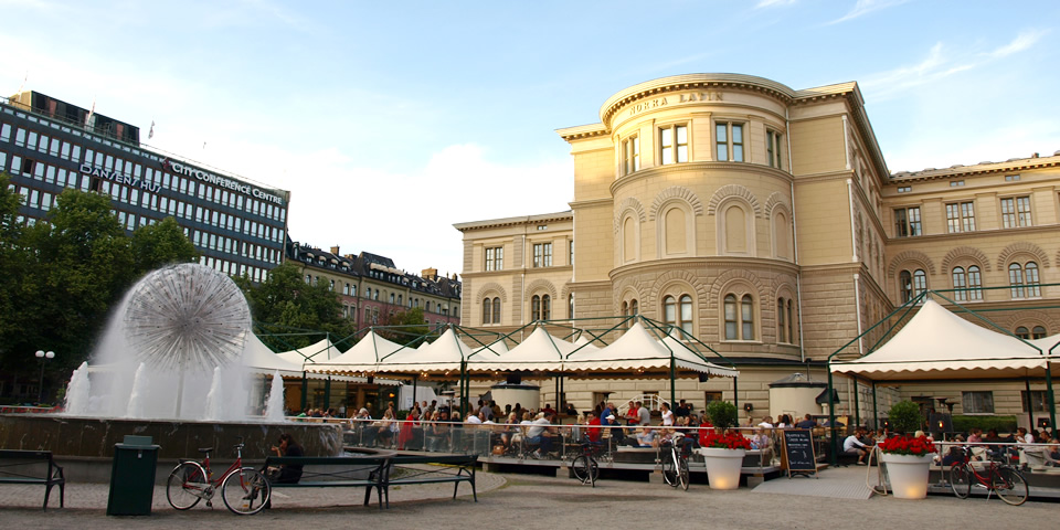 クラリオン・ホテル・サインの前のノーラ・バーントリエット広場は、ストックホルム市が新しい公園として再開発しているとか。向かいのノーラ・ラテン国際会議場(写真)には、たんぽぽの綿のようなモダンな噴水とオープンカフェがあり、みんな椅子ではなくソファでくつろぎながら、リッチにディナーを楽しんでました。みんな、優雅で絵になります。