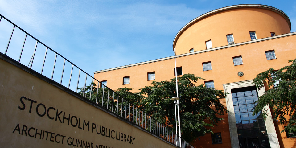 ストックホルム市立図書館(Stockholms Stadsbibliotek)は、オレンジ色の円形ホールと周りを囲むキューブ形のフロアでできていて、シルエットがユニークで愛着がわきます。世界遺産の「森の墓地」には行けなかったので、どうしてもアスプルンドの建築物を見たかった! スヴェア通りから公園の池を通って、エントランスの階段をのぼると……感動。素晴らしすぎます。こんなところで本を読み、何か学べたらどんなに幸せだろう。 みなさん、本物の図書館は北欧にあります!