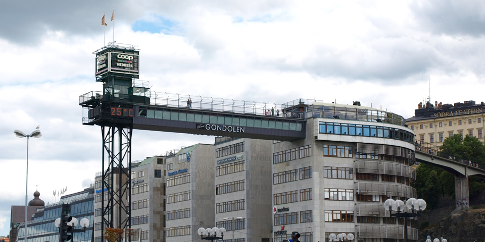 地下鉄スルッセン(Slussen)駅の近くにある地上33メートルの展望レストラン、エリックス・ゴンドーレン(Eriks Gondolen)。創作スウェーデン料理を楽しみながら、湖に浮かぶストックホルムの島々を一望できます。残念ながらレストランを下から見上げるだけでしたが、食事をしなくても空中廊下までは行けるみたい。「北欧のヴェニス」の絶景が味わえます。