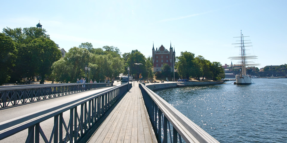 シェップスホルメン島へつづくこの橋の真ん中には王冠のマークがあって、そこはストックホルムのランドスケープをカメラにおさめることができる絶好の撮影ポイントです! 何度も雑誌やパンフレットで見た、あの景色……この都が世界一美しいと称されるのがわかります。湖も島も、橋も船も、目に映るすべてのものがきらめいています。すぐに渡りきってしまうのは惜しいくらい神秘的な橋です。