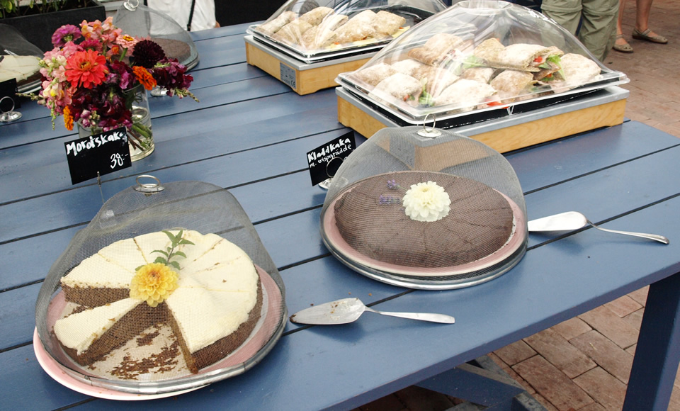 カフェのランチはセルフサービス。テーブルには、サンドウィッチやシナモンロール、ケーキやタルトやクッキーが並び、焼き菓子の上には庭で摘んできた花が添えられ、彩りも豊か。ついつい、水色のトレイにあれもこれもといっぱい乗せてしまいます。黒板にスウェーデン語で書かれた「TODAY'S LUNCH」は3種類。キッチンで調理してから出てきます。おさだゆかりさんのおすすめは「トマトと茄子のブルスケッタ」だとか。あー、もっともっと食べたかった!