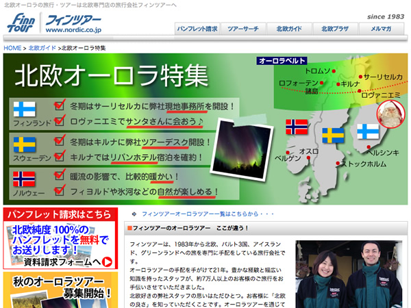 北欧専門旅行会社 フィンツアー 「北欧デザインを感じる旅」や「オーロラ」「フィヨルド」ツアーなど、北欧・バルト三国・アイスランド・グリーンランド専門の旅行会社。北欧はじめての方におすすめ。 北欧のできごとをつづったスタッフブログのオーロラ写真が印象的。フレンドリーで、心あたたまる、ほっこりな感じが好きです。