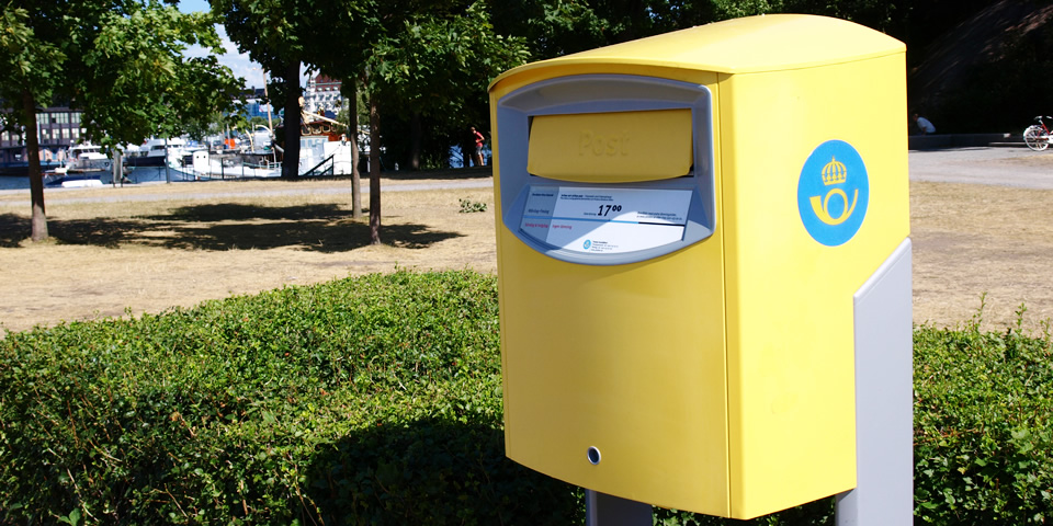 角笛と王冠がスウェーデン郵便局のシンボルマーク。ポスト(写真)は国旗と同じ黄色と水色の2つがあり、水色は市内へ送るもの、それ以外は黄色いポストへ。