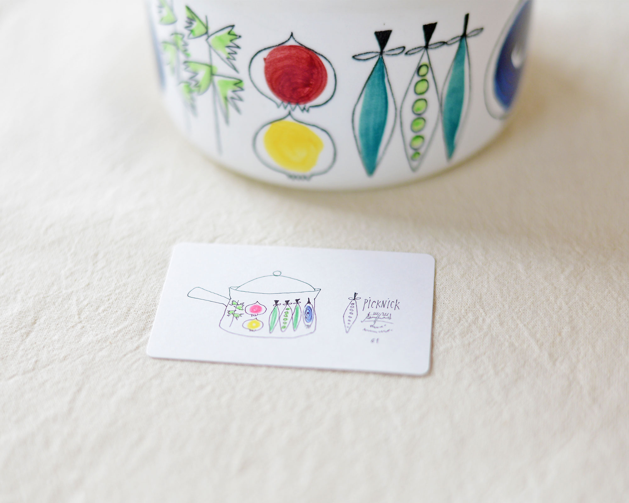 北欧フィーカの「北欧ヴィンテージ ぬり絵カード」は、スウェーデンの蚤の市で出会ったピクニックの鍋から生まれました。