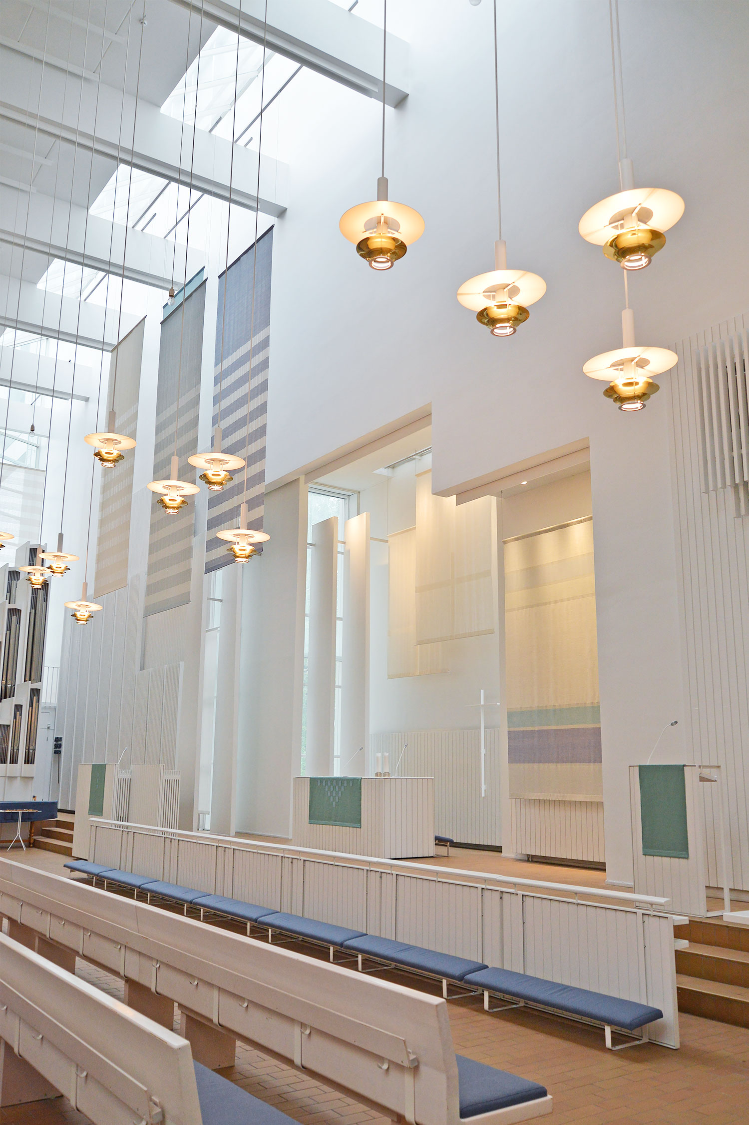 空へのびる白樺のような柱。ふわりと浮かび上がるクリスティーナ・ニュルヒネン〈Kristiina Nyrhinen〉の大きなタペストリー。白い十字架の祭壇には、正午近くになると光のシャワーが降り注ぐといいます。