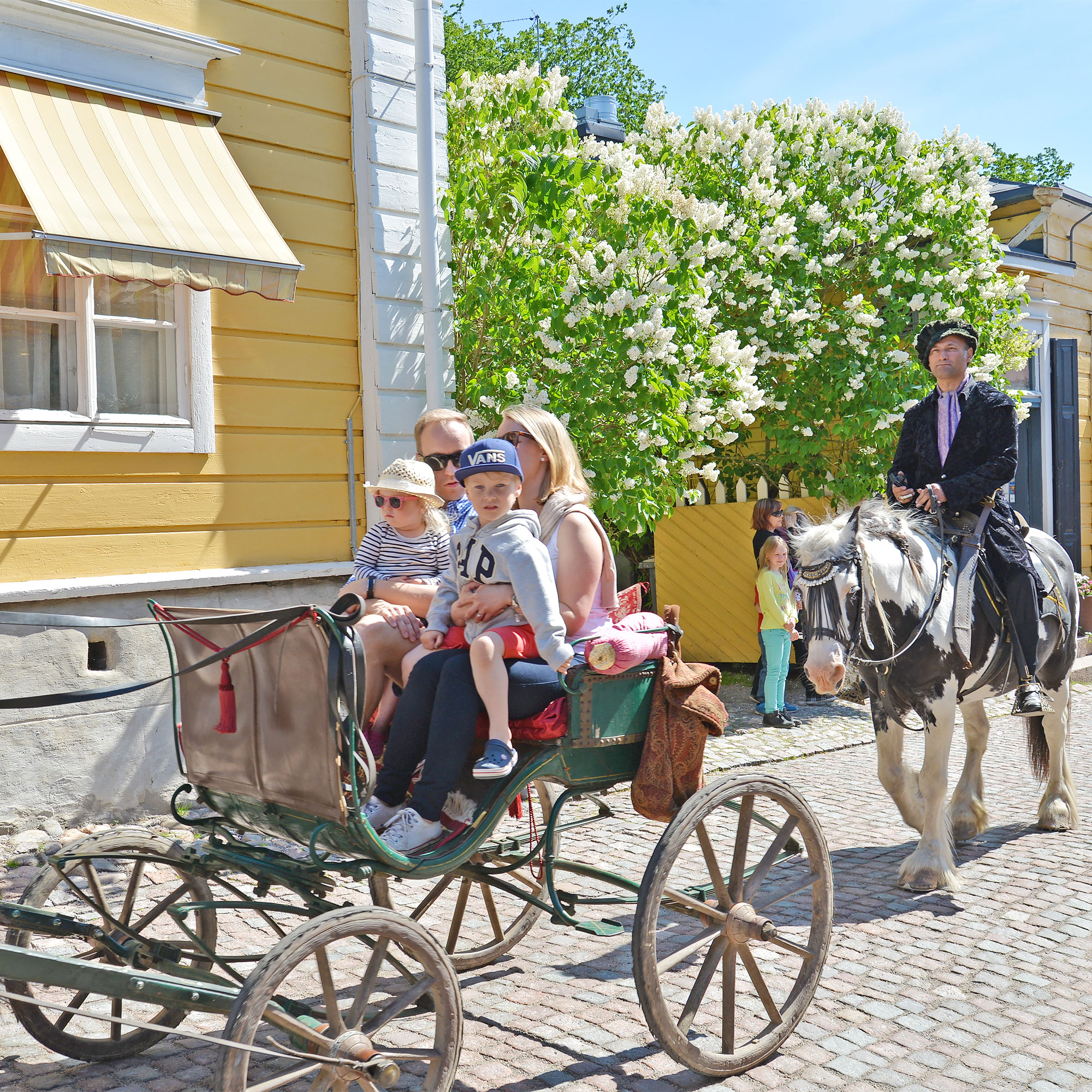 パステルイエローの可愛いカフェの前ではバイオリンとクラシックギターの演奏がはじまっていて、軽やかな音色に心弾みます。古いお屋敷のような店内にはいろんな種類のケーキが並んでいましたが、迷わずルーネベリタルトを注文!満開のライラックが香る、ガーデンテラスでいただきます。