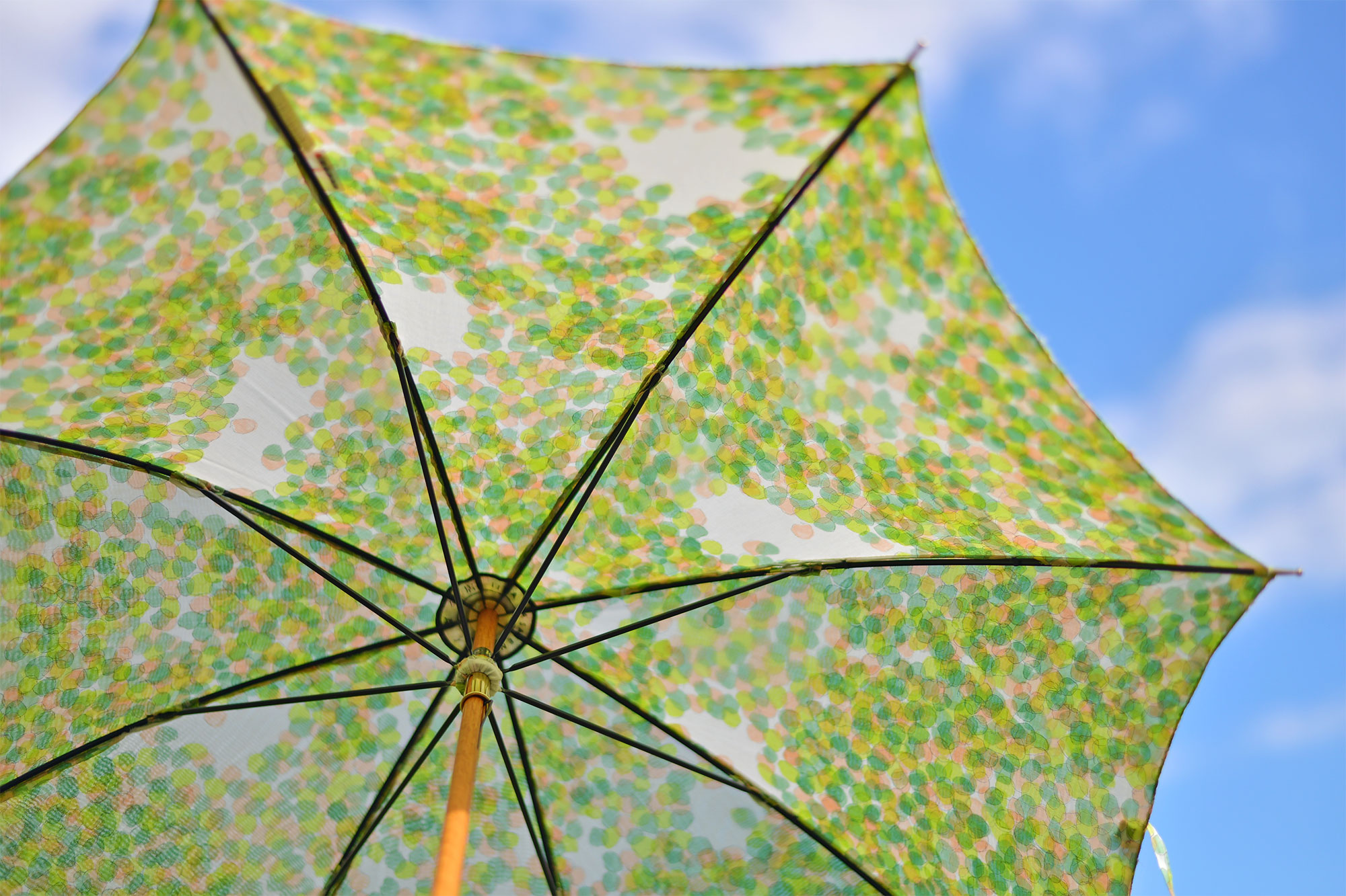 薄いシルクコットンの生地にプリントされた新作テキスタイル「こもれび」は、幾重にも重なった木々の葉の木漏れ日のように、二重張りで傘に仕立てられています。緑色の「こもれび」日傘の名前は「新緑」、赤色は「紅葉」。「こもれび」はイイダさんが、何年も前から日傘にしたくてスケッチし続けていたのだそうです。とある散歩道で、いい木漏れ日に出会い、このテキスタイルが生まれたのだとか。