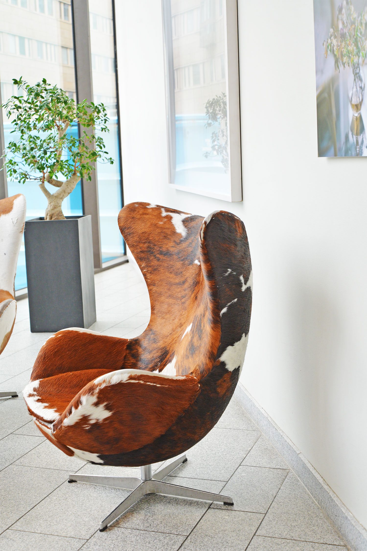 光さすエレガントなロビーには、デンマークの巨匠アルネ・ヤコブセン〈Arne Jacobsen〉のエッグチェア〈The Egg〉がずらり。体をすっぽり包み込んでくれるエッグチェアは発泡ウレタンの素材のほか、シックなレザーやゴージャスな毛皮張りのものもありました。ロビーのウィンドウの向こうは緑と公園があり、ああもう、ここでゆっくりくつろげるだけで幸せ。