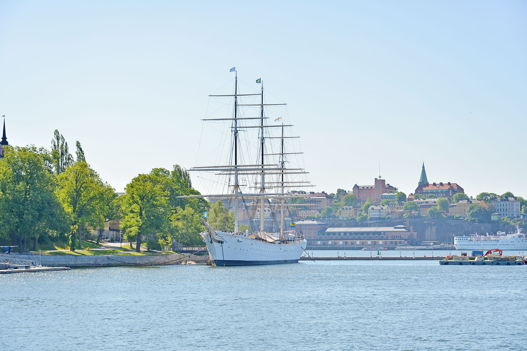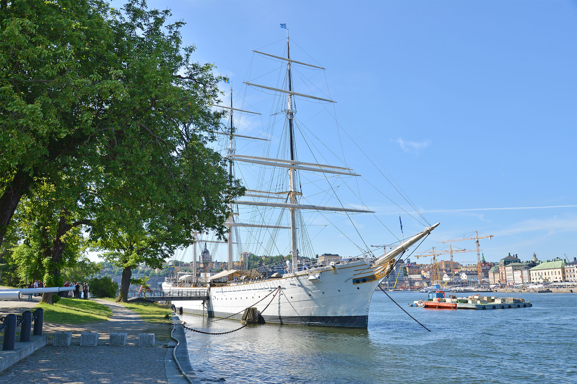 地下鉄クングストラッドゴーダン駅を出て、王立公園〈Kungsträdgården〉を抜けると、ストックホルムのノール運河が広がり、クルーズツアーに並ぶ観光客であふれています。 運河クルーズのフェリーターミナルを通って、国立美術館から南につながる小さな橋を渡ると、そこはシェップスホルメン〈Skeppsholmen〉という名の小さな島。 向こうには、きらめく湖に浮かぶガラム・スタンが見えます。