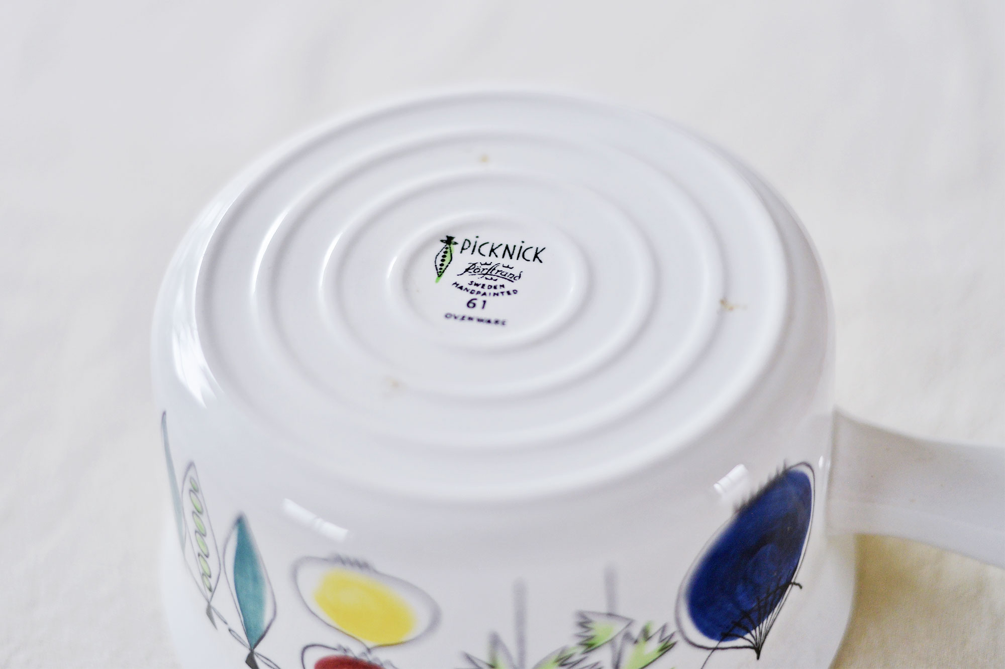 タマネギ、赤カブ、ニンジン、エンドウ豆など、ポップな野菜が描かれたマリアンヌ・ウエストマンのピクニック〈PiCKNiCK〉。ロッピスで見つけたピクニックの鍋に一目惚れ。傷もほとんどなく、鍋底には〈Rörstrand〉の刻印が。お値段は500SEK(約7,500円)……ほしい!店のおじさんも「どうだ?うちのマリアンヌは美しいだろう?」と鼻高々です。