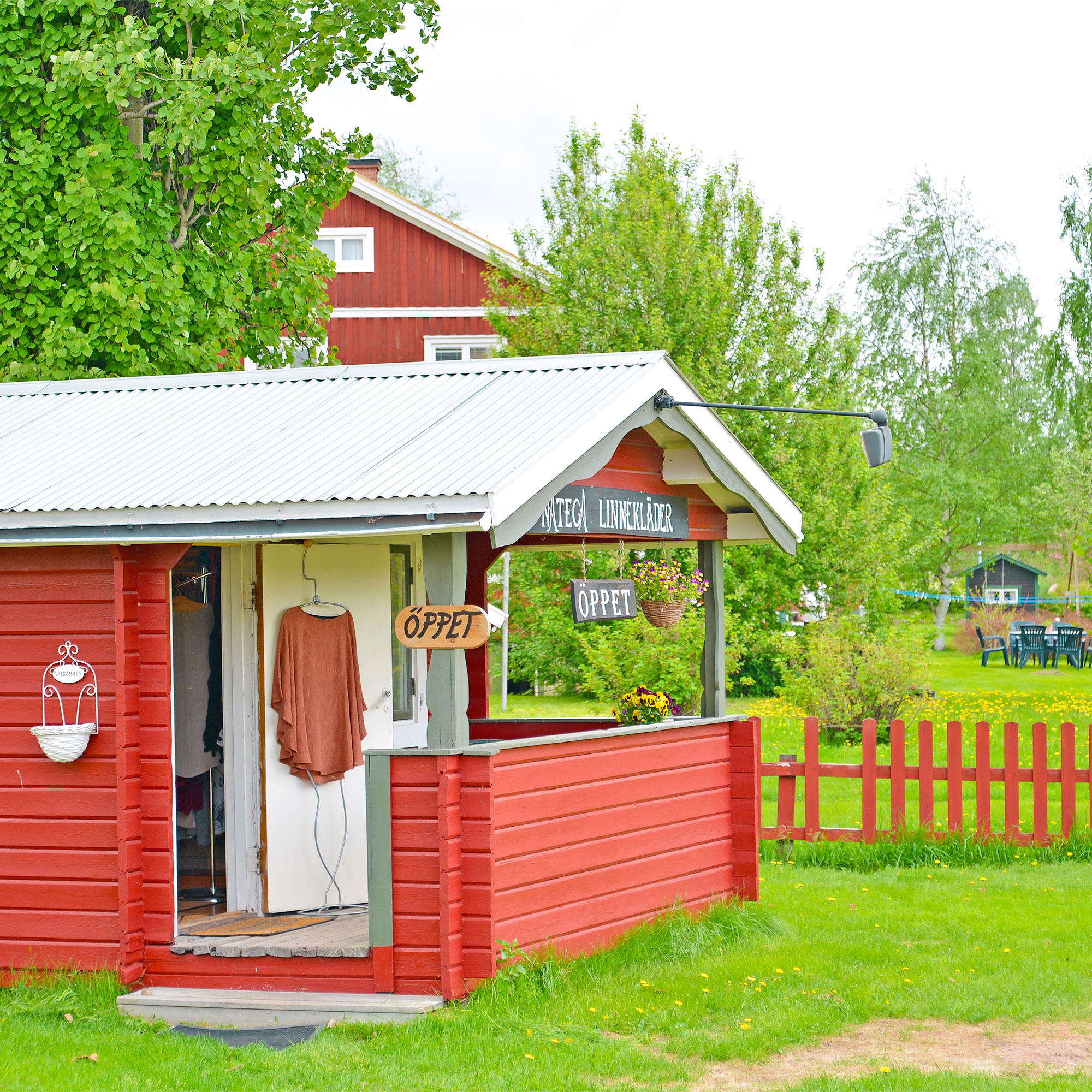 ダーラナの小さな村 ダーラフローダ〈Dala-Floda〉を訪れ、バスを降りると、最初に目にする赤い小屋。ここは村にひとつだけのおみやげ屋さん、手工芸店のフローダ・ヘムスロイド〈Floda hemslöjd〉。