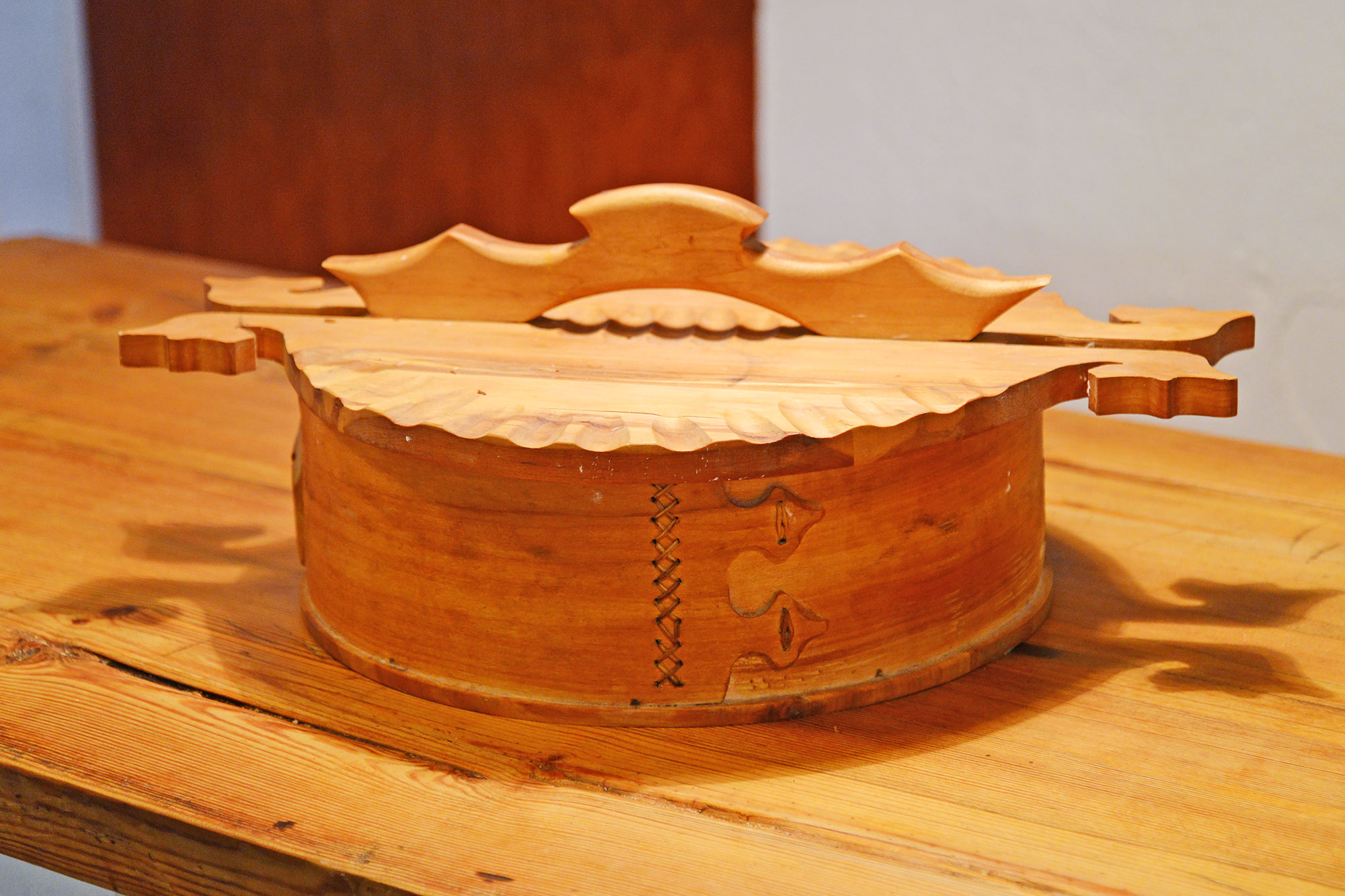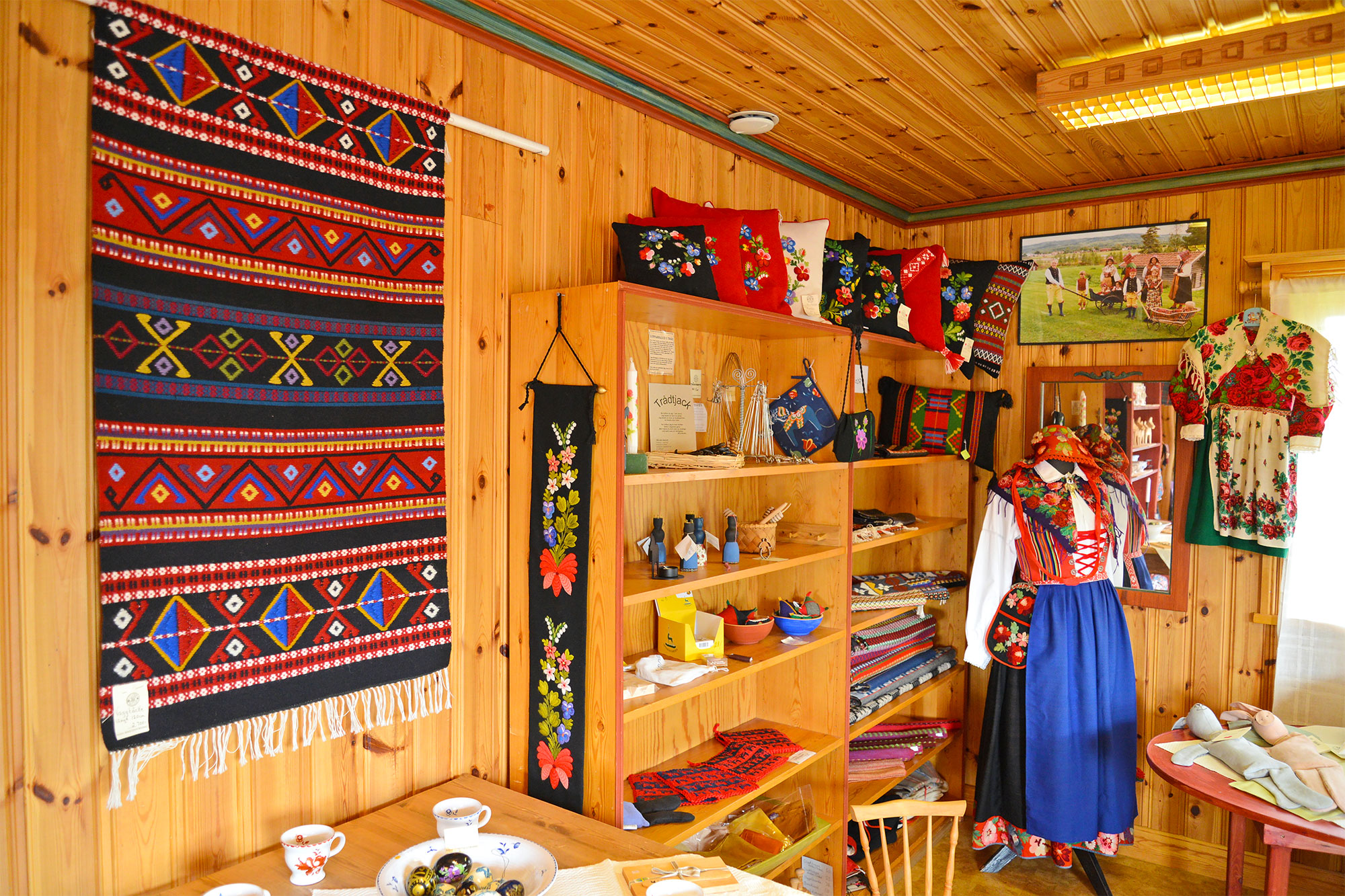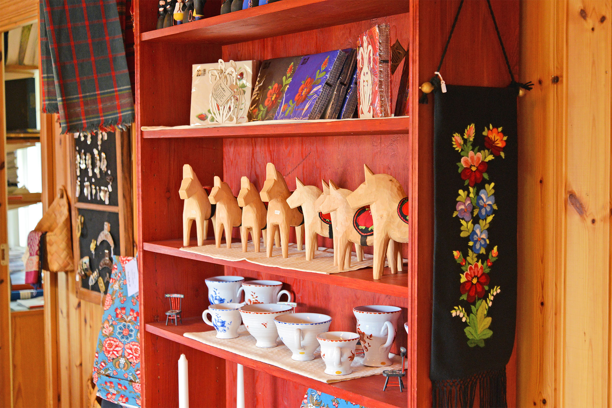 フローダ・ヘムスロイドの店内には、お馴染みの木彫り馬のダーラヘストほか、白樺細工や編み物、織物など、村の女性たちがつくった手づくり民芸品が並びます。