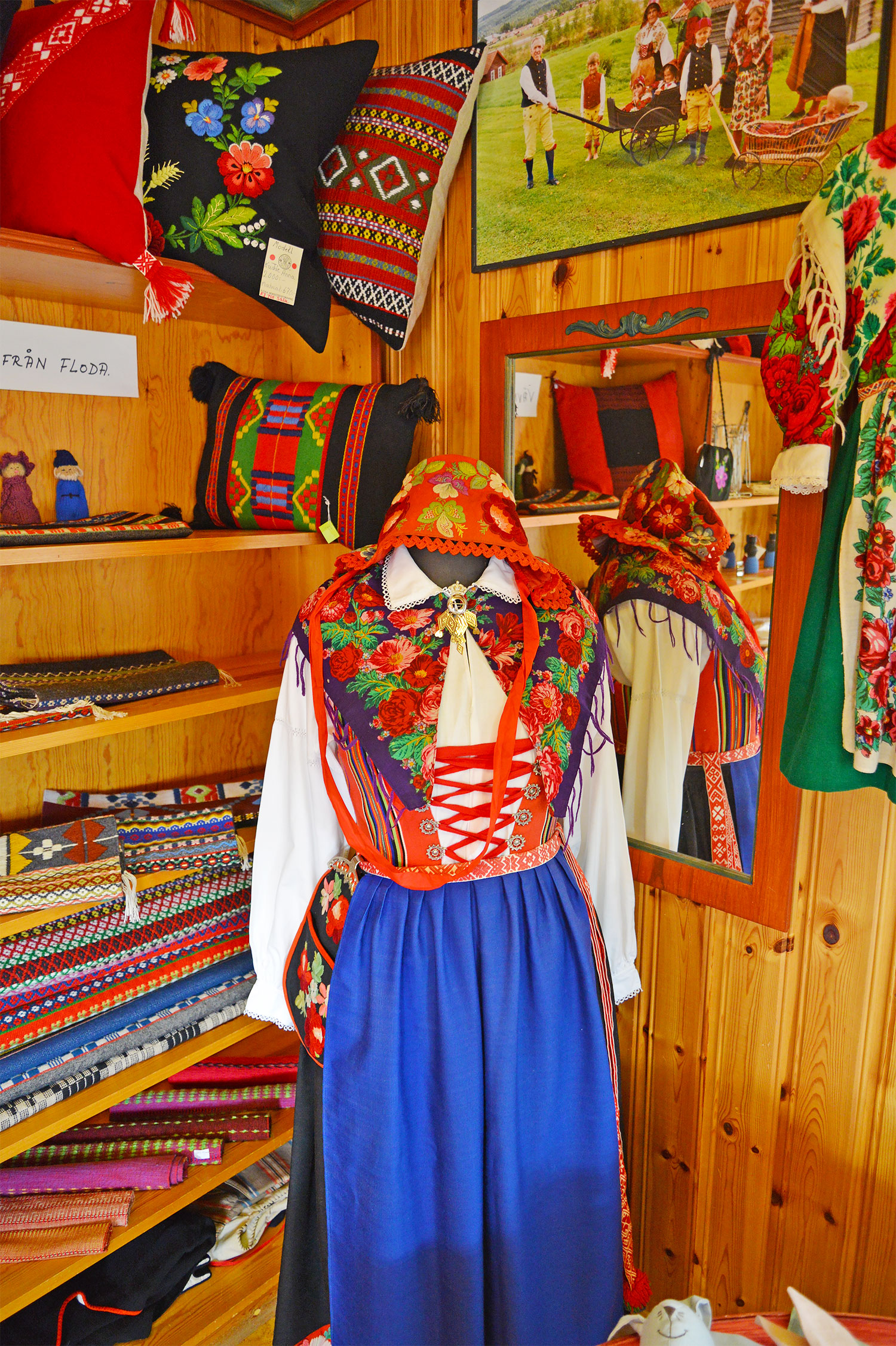 小さなお店いっぱいに、花模様の可愛らしい民芸品が並んでいます。その中でも、特に目を奪われたのは赤と青の色あざやかな民族衣装。スウェーデンでいちばん美しい民族衣装に選ばれた、フローダのポーソム刺繍のドレスが、この村の歴史と未来をつむいでいるのです。