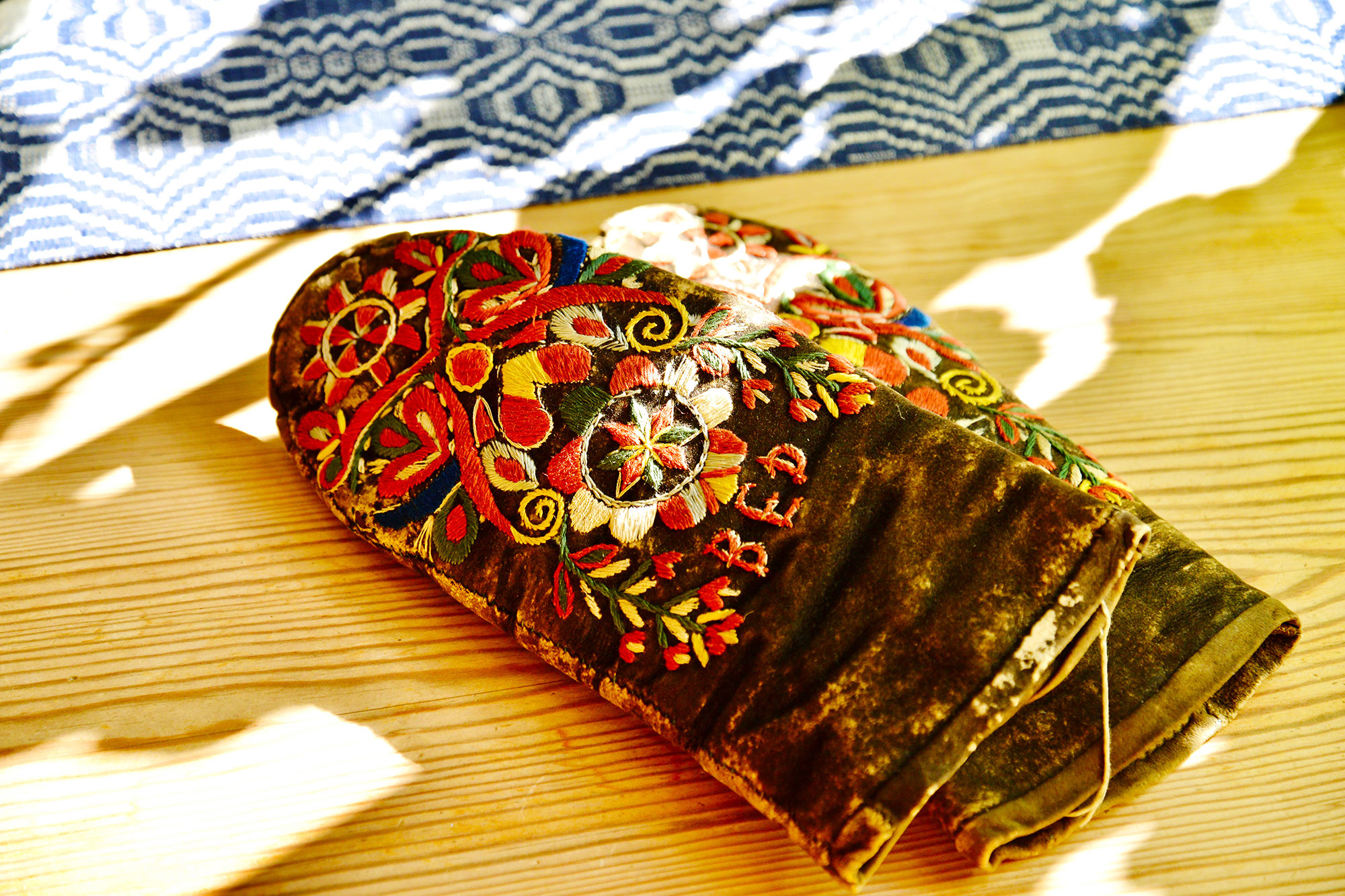 ダーラフローダの民俗衣装のケープやスカートのベルト、エプロンにつけるポシェット、帽子や手袋にもほどこされている、野の花をあしらった色鮮やかなウールの刺繍はポーソム〈Påsöm〉と呼ばれていて、この村の美しい伝統のひとつ。やわらかな毛糸のポーソム刺繍にふれてみると、花や葉がふんわりと浮かび上がっているのがわかります。