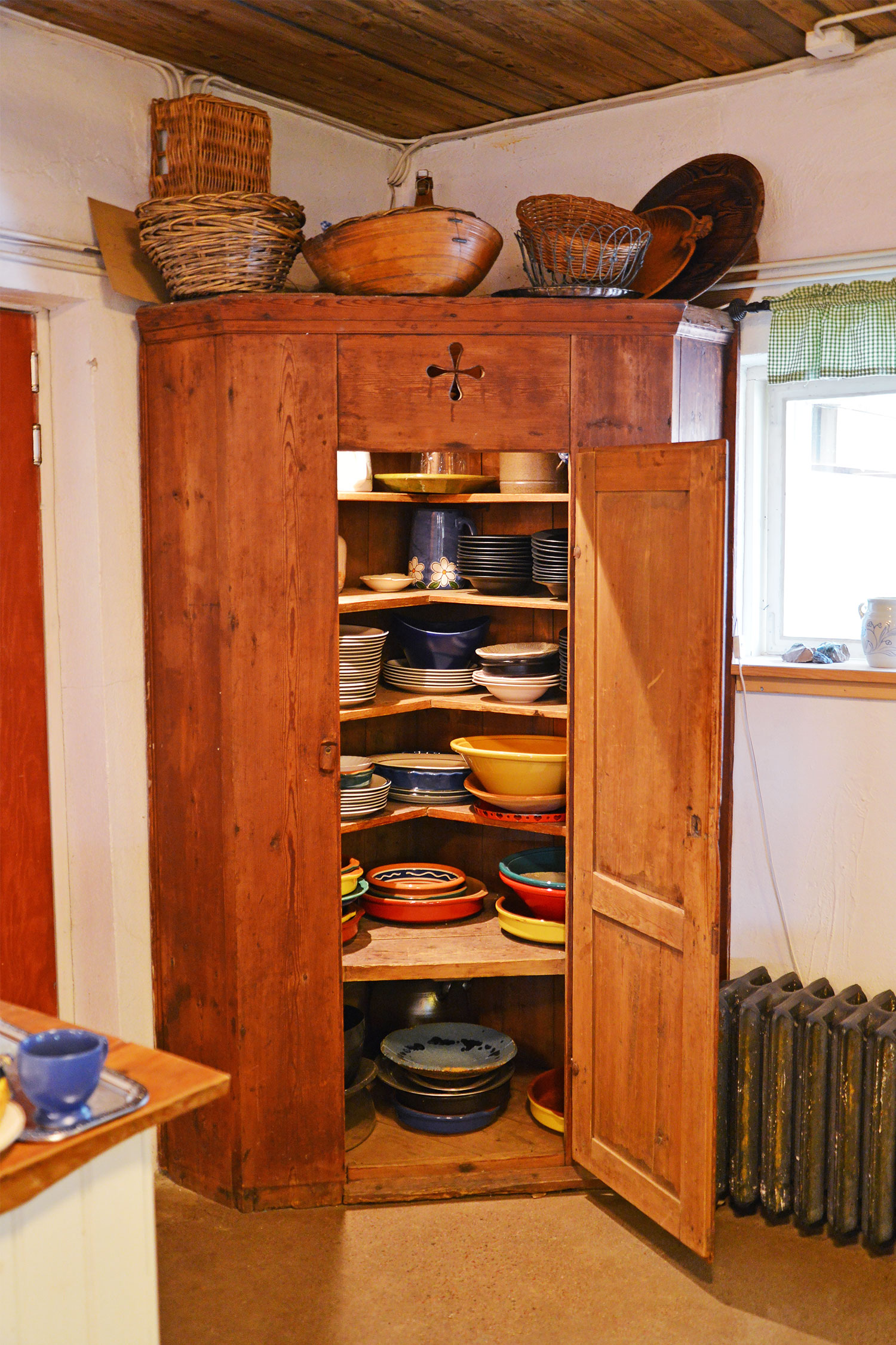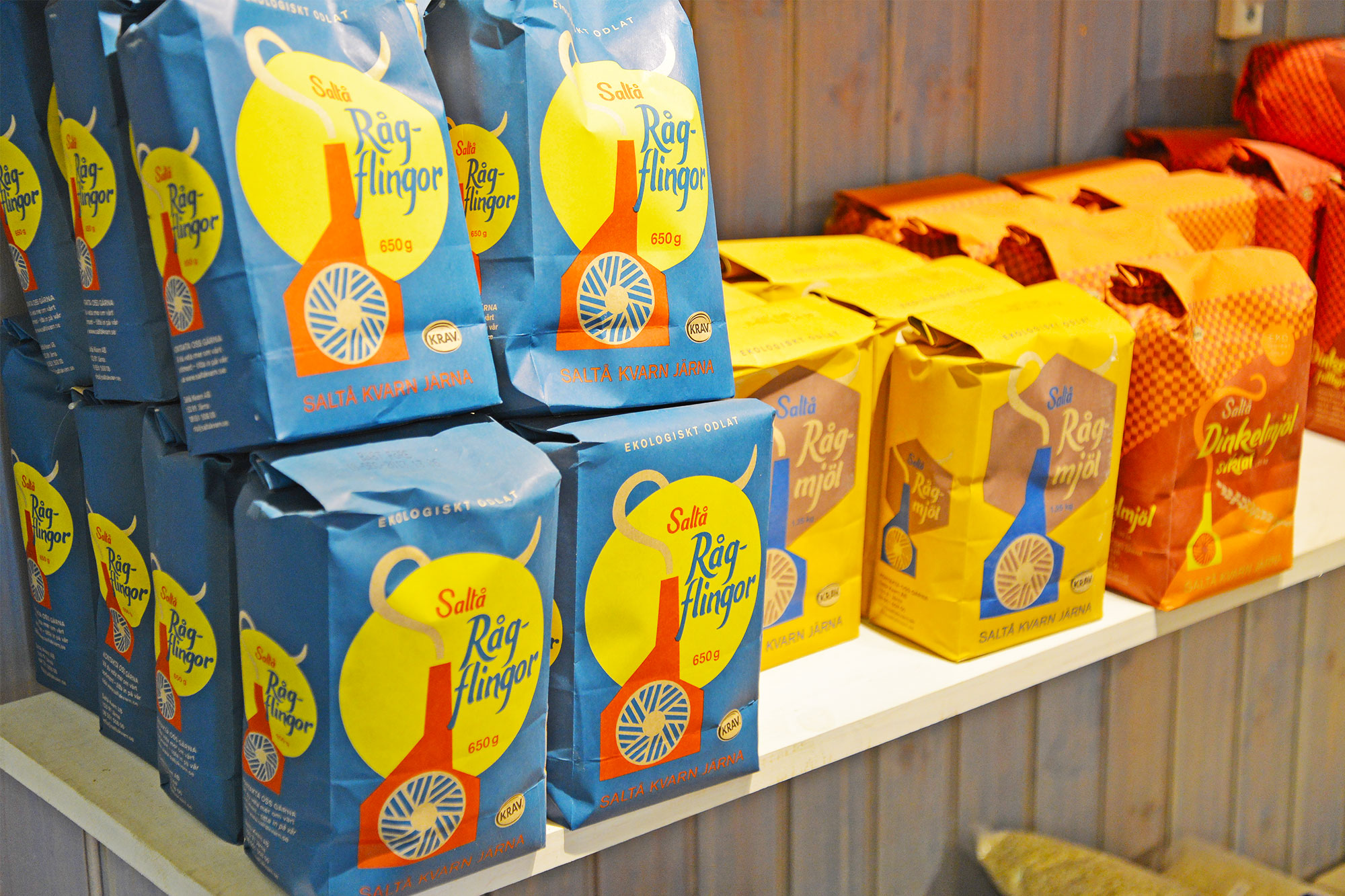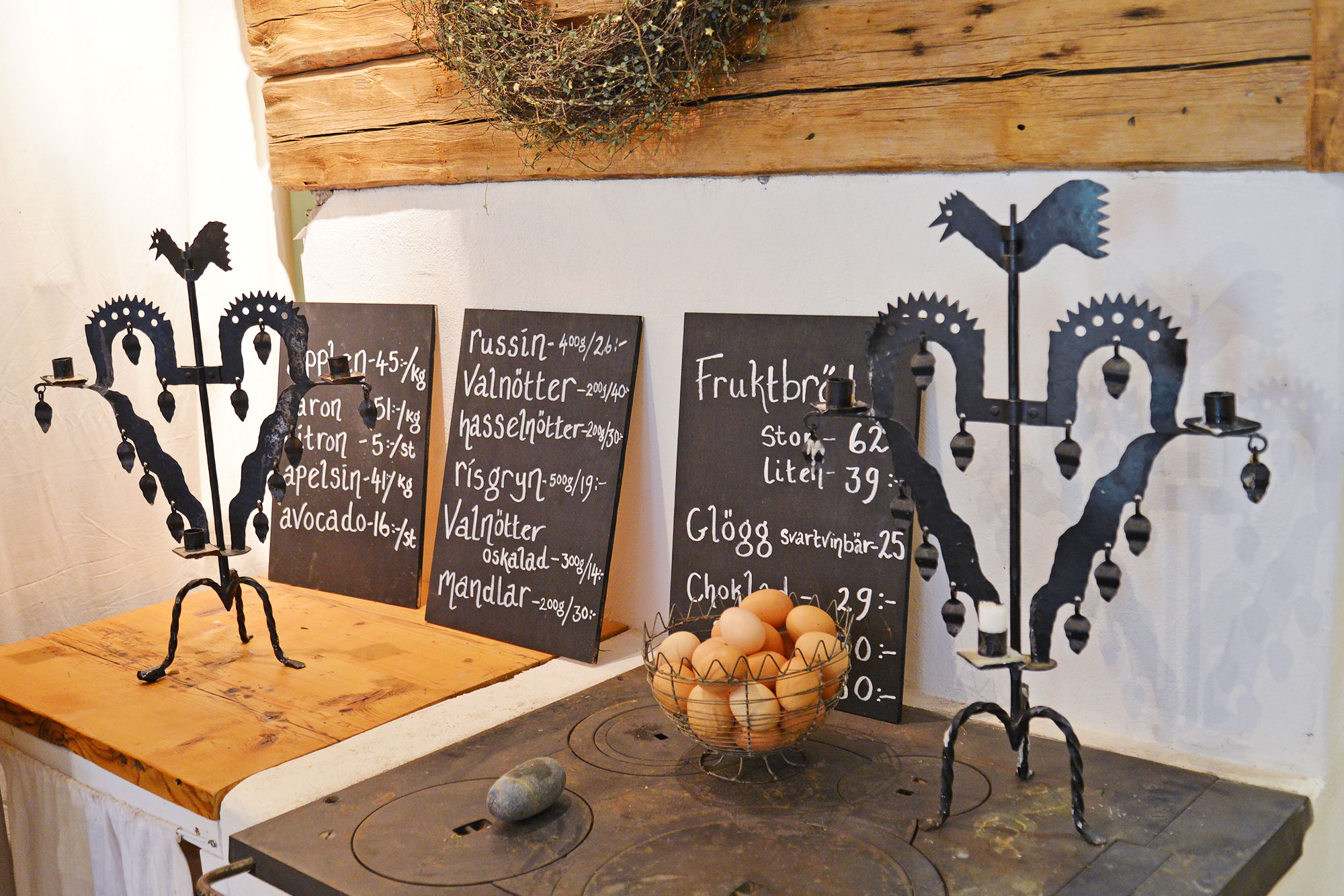 ヴォルステッズのファームショップ&レストランは小さいけれど雰囲気があって素敵で、窯から焼きあがった大きなまあるい田舎パンの香ばしい香りが漂っていました。田舎パンの横には、スウェーデンの伝統的な工芸品のブレッドバスケットや、可愛い食器がつまったホーンスコープと呼ばれる古い木製戸棚、卵といっしょに飾られたユニークな鉄細工の鳥のロウソク台など、心をくすぐるものばかり。