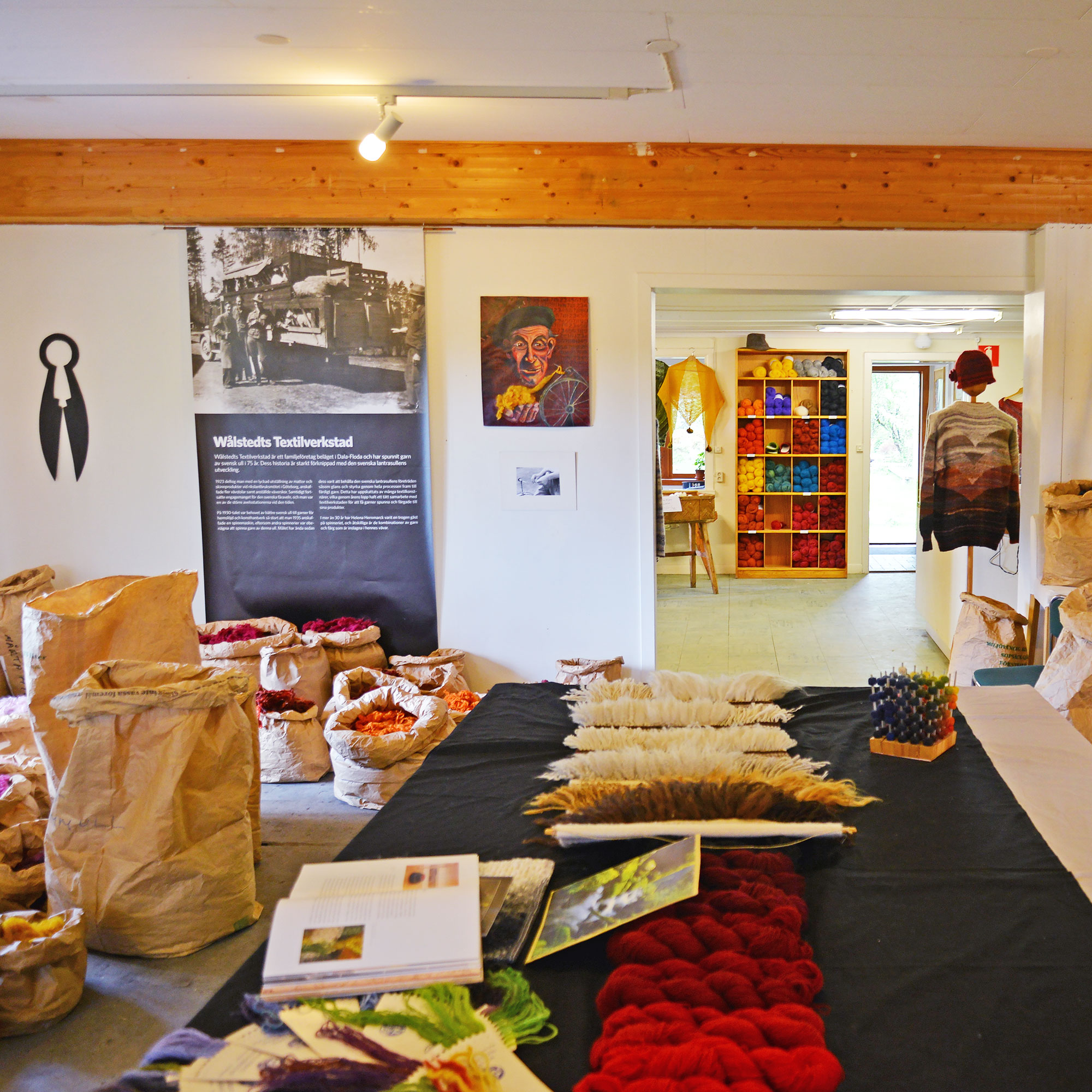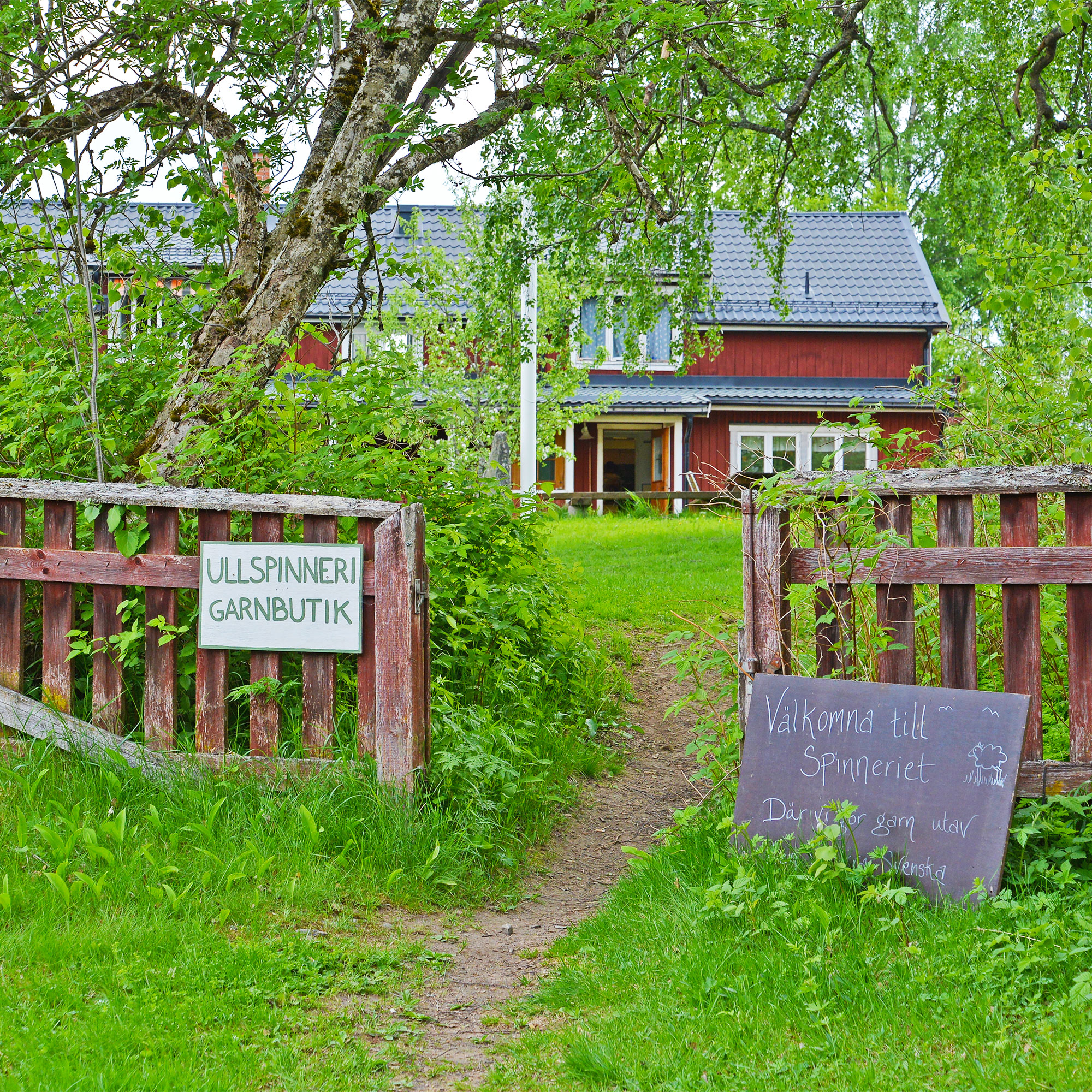4世代にわたって受け継がれてきた、ダーラフローダの毛糸工場ヴォルステッズ。ロゴにひつじ、家族、ダーラナ、糸車が描かれているように、家族経営のヴォルステッズは工場というよりも、もっとアットホームな感じ。緑あふれるのどかな場所にファールン・レッドの赤いおうちがあり、そこがヴォルステッズの毛糸ブティック。