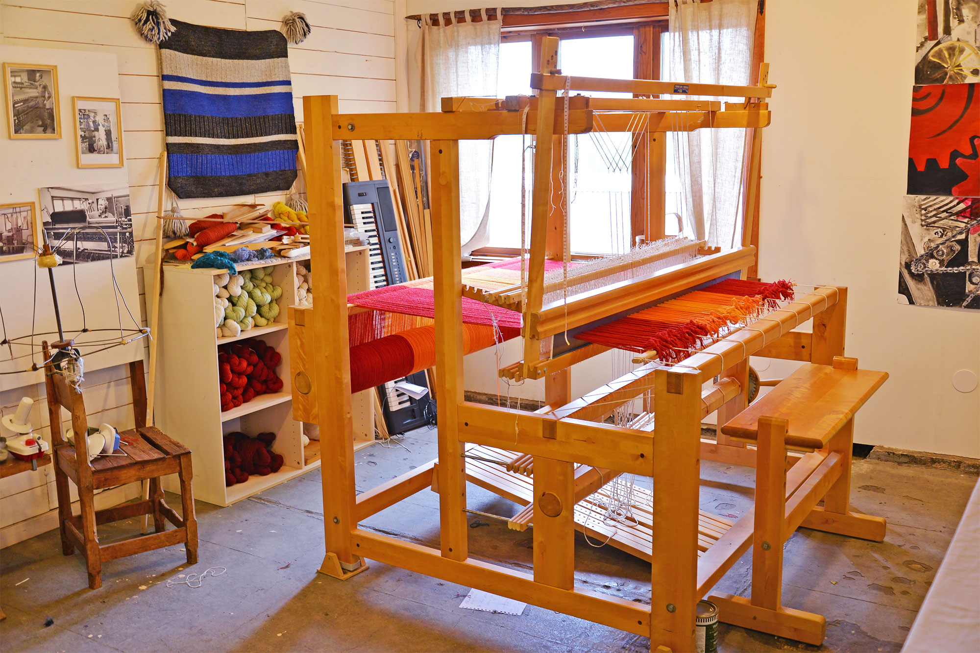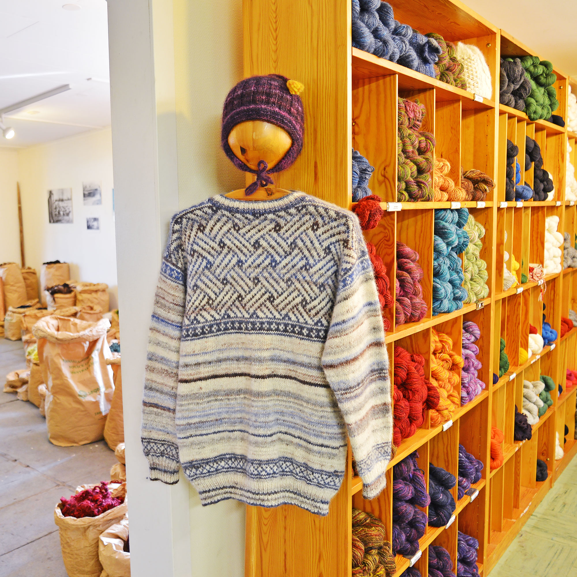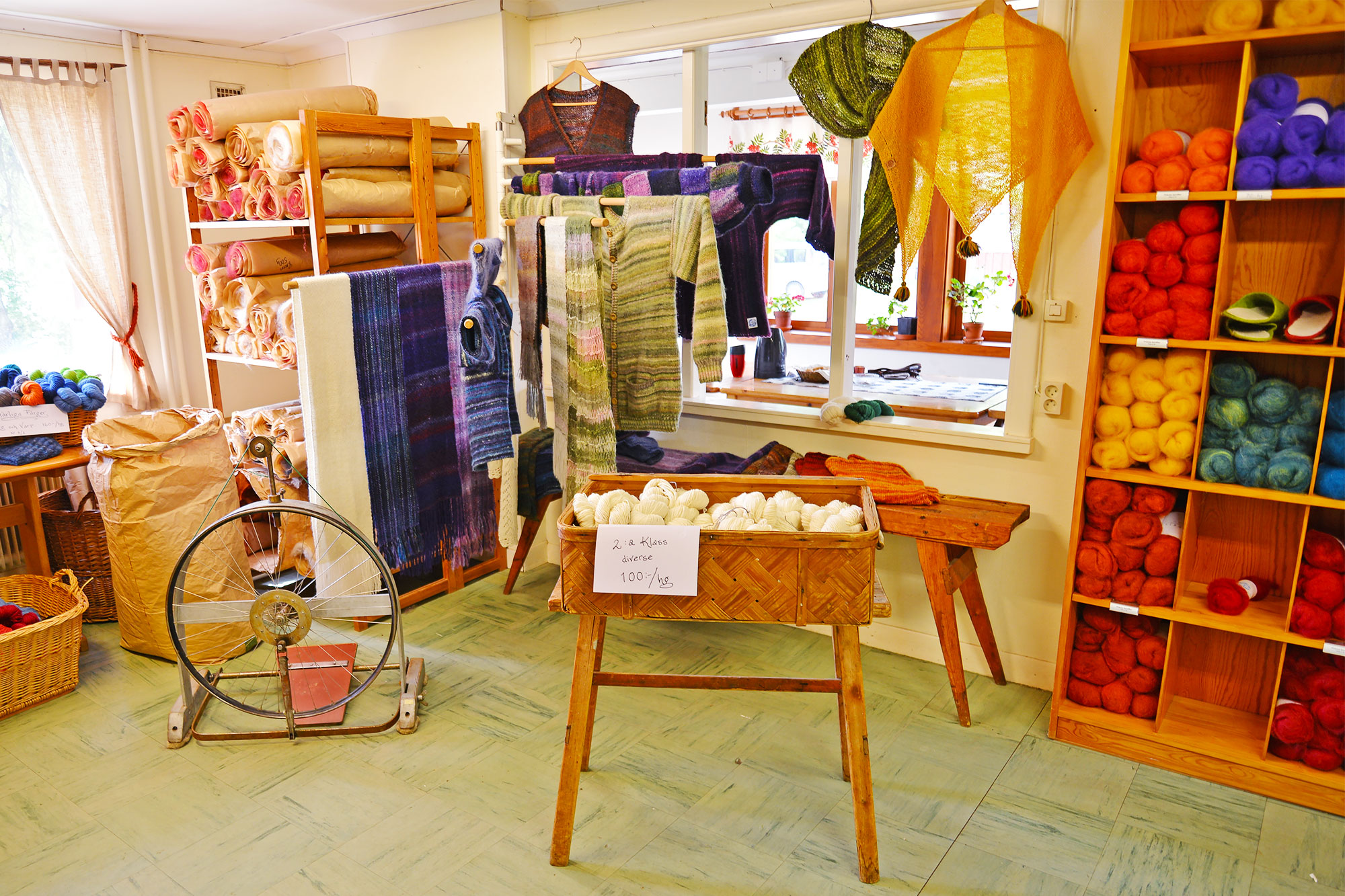 中に入ると、フローダの伝統的な編みものやスウェーデン製の織り機といっしょに、さまざまな色に染色されたウールが紙袋にどっさりと入っていました。不思議なのは、深みのある色あいのウールがきらきらと輝いていること。 ウォルステッズでは、スウェーデンのランドラース(国産種)の厳選した羊のウールを工場でつむいで染色し、毛糸に仕立てています。つややかな光沢が魅力の最高品質のウールは、独特の輝きとしなやかさを持っています。