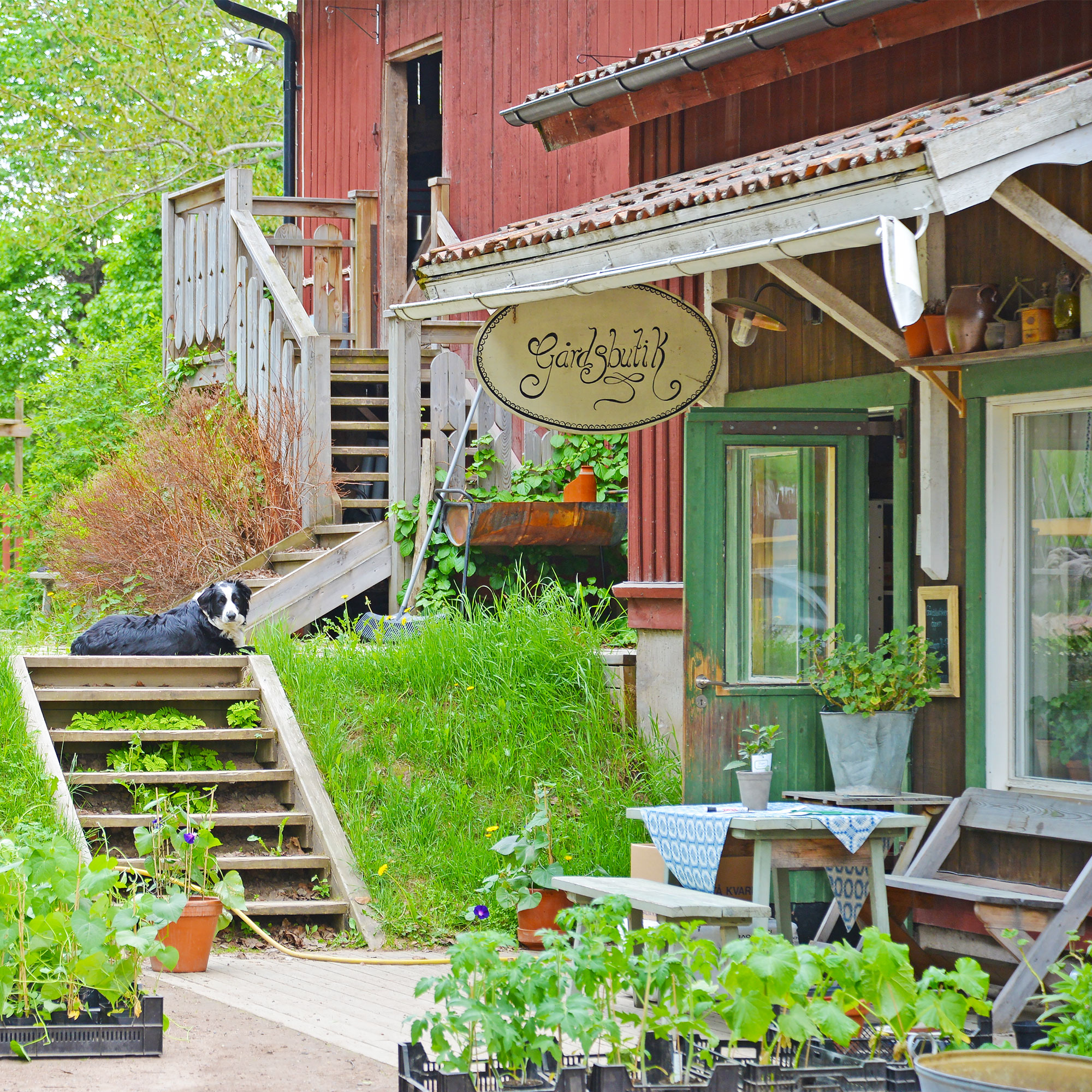 毛糸工場、ファームショップ&レストランだけじゃなく、(写真の)ボーダー・コリーがしっぽをふっている奥の建物には、なんとサーカス学校〈Cirkusläger i Dala-Floda〉もあるのです!ウォルステッズって楽しい!