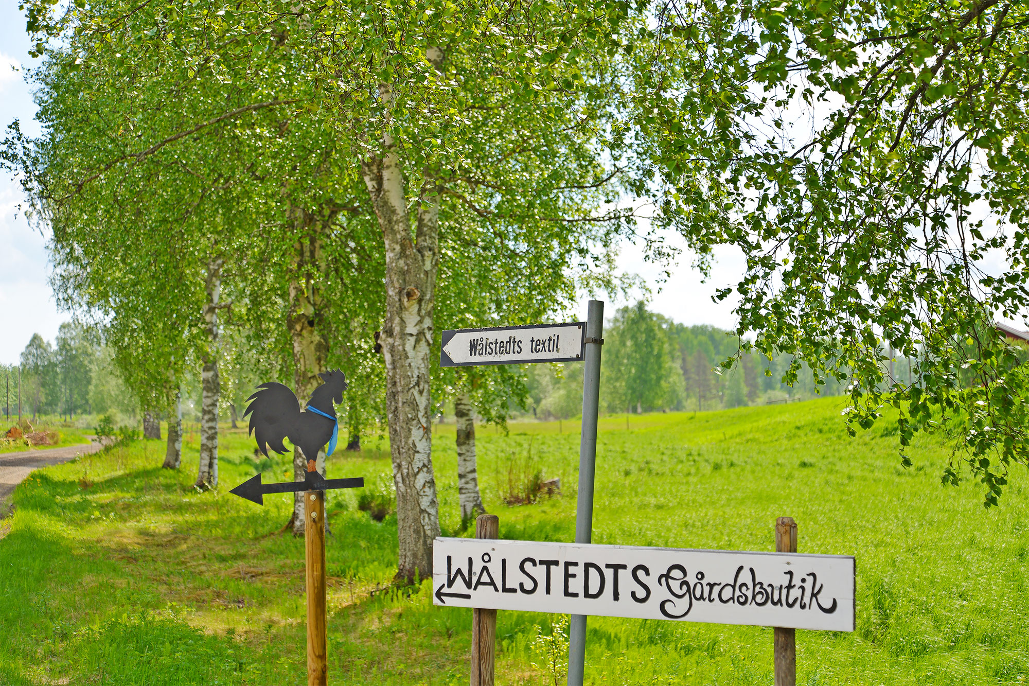 道の途中、庭でFIKAしている赤い家々の家族に「Hej!(ヘイ!)」とごあいさつ(片手を軽く上げるのがポイント)。草原のひつじにも「Hej!」、馬にも「Hej!」。畑の道にぴょんと立っているニワトリのサインが見えて、毛糸工場は「こっちだよー」という矢印が出ていればもうすぐ。