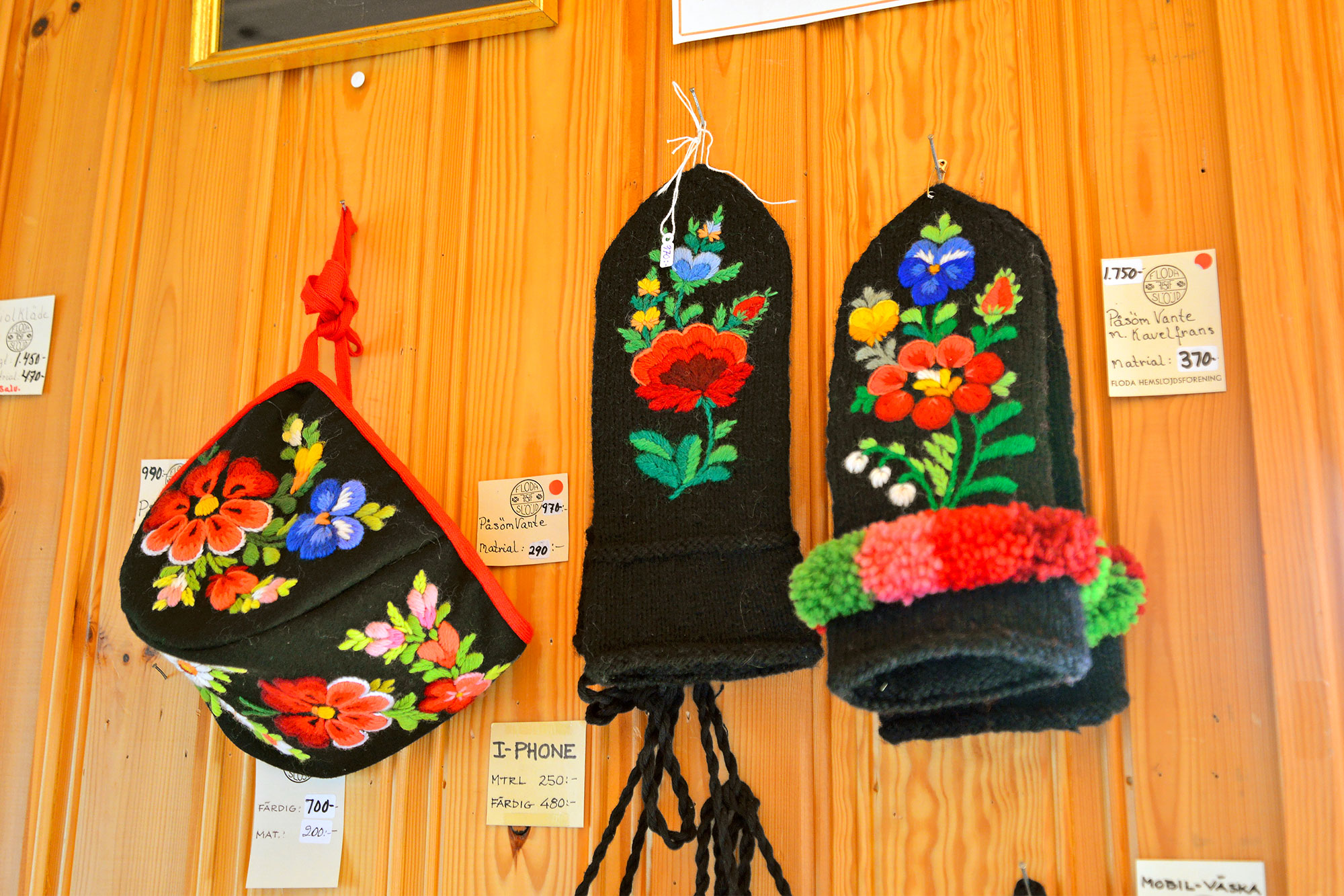 黒いミトンのポーソム刺繍は、フローダ村のかわいい看板にもなっていて、ポーソムのタペストリーやカーテンも人気なのだとか。