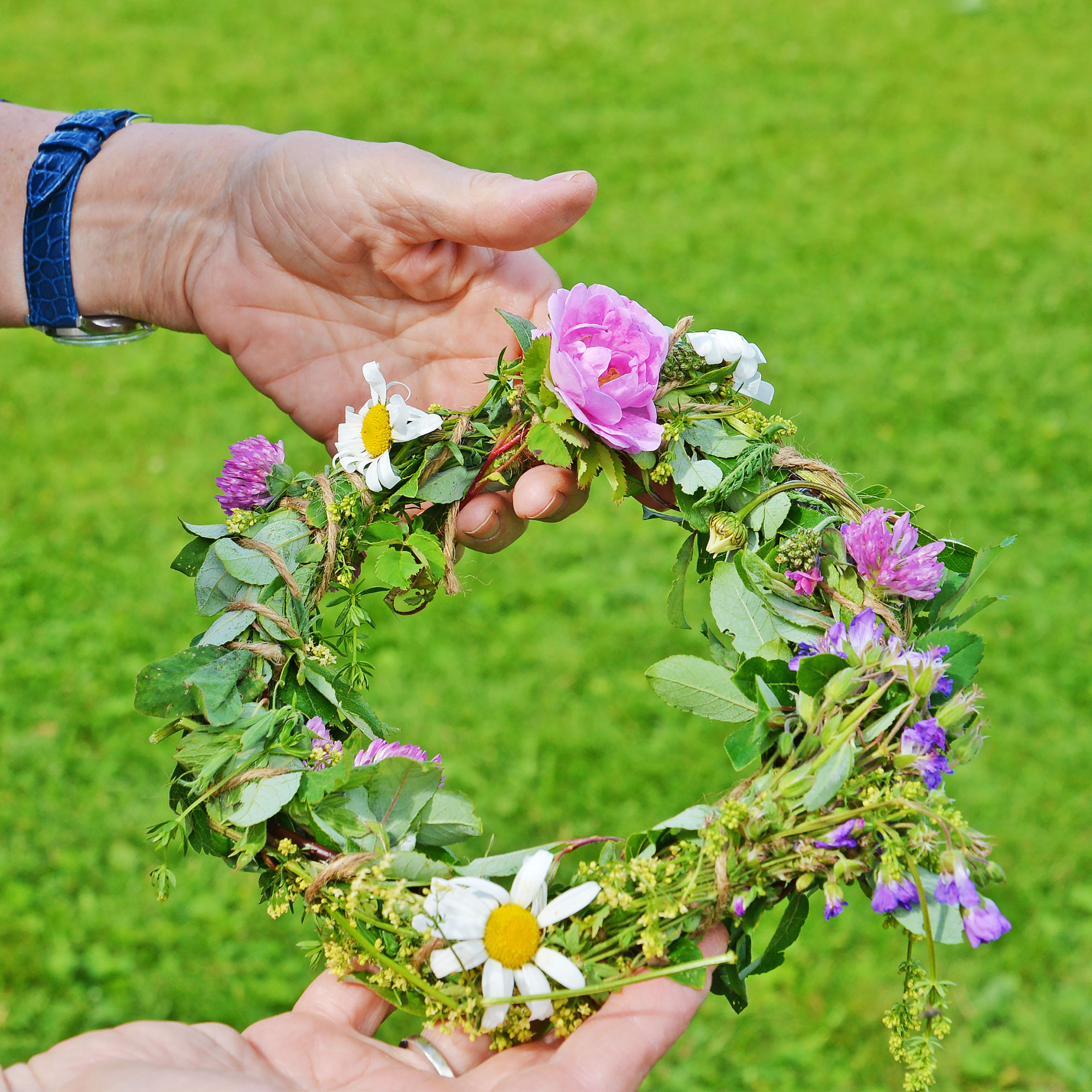 冠を編む花の種類は色々で、白樺の葉や「夏至の花」と呼ばれるゼラニウム、白いレースフラワー、バターカップ(キンポウゲ)、バラ、マーガレット、ベルフラワー、ワスレナグサ、スズランなど、野草の花を摘み採ります。