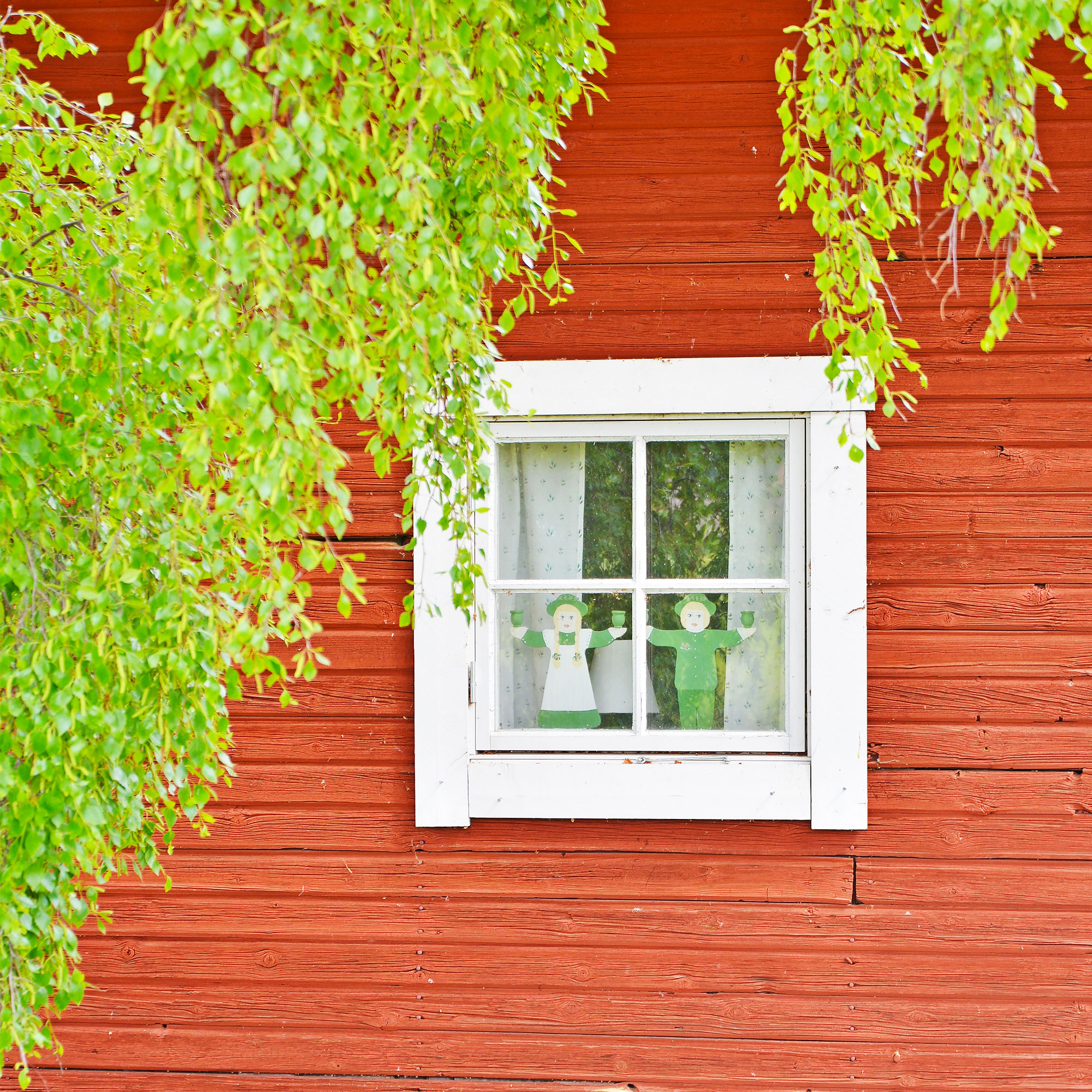 ダーラナ地方のレクサンド〈Leksand〉から北に15km。森と湖の畔にスウェーデンの伝統的なファールンレッドの赤い家が建ち並ぶかわいい村、テルベリ〈Tällberg〉にやってきた。 スウェーデンの原風景が残る、ダーラナの田舎の景色。小高い丘の上のテルベリ村からのシリヤン湖の眺めは最高。ミッドサマー(夏至)を迎えた村のあちこちで黄色と水色のスウェーデン国旗がはためいている。 赤い家の窓からは、木彫り馬のダーラヘストやかわいい人形が顔を出して「Hej! こんにちは!」と歓迎してくれてるみたい。どの庭もよく手入れされた芝生の絨毯がきれい。全自動の芝刈り機が元気に働いていた!