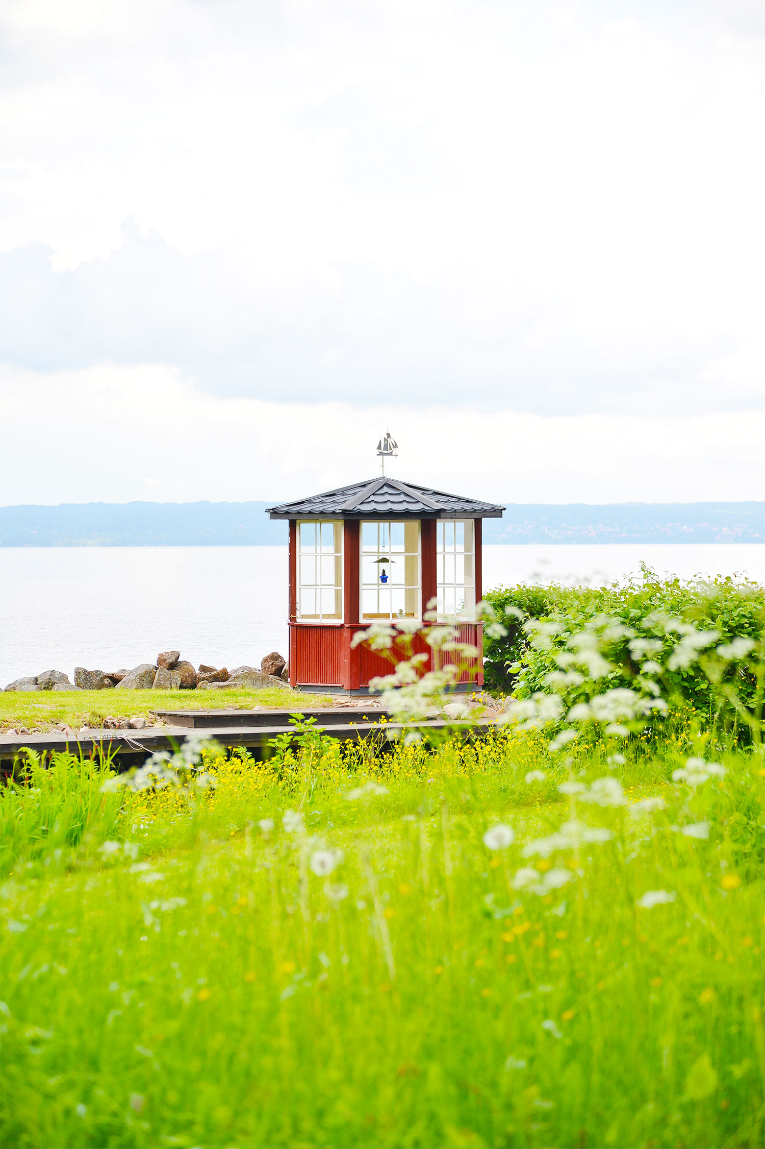 ビョルンさんの工房を出て、テルベリ村をお散歩。田舎道を歩きながら、赤いかわいい家やお庭を拝見。六角形の湖畔のガゼボやサウナ小屋を見つけた。