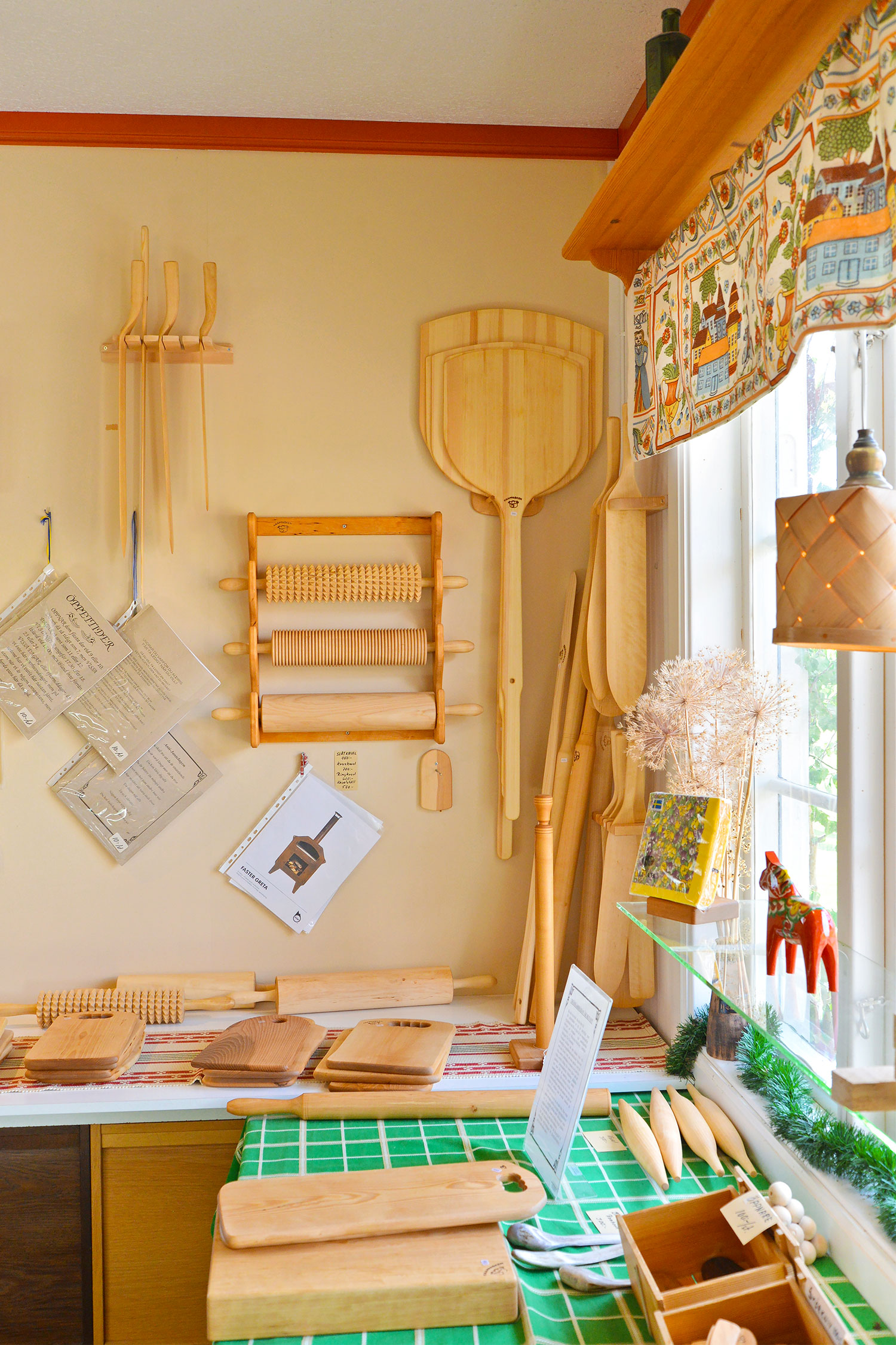 ビョルンさんのおうちの隣に建つ赤い小屋のクネップアスケン〈Knäppasken〉は、スポーンコリの工房兼ショップになっていて、へぎ板のバスケットの他にも、木のスプーンやバターナイフ、ピザピール、パンの生地をのばすめん棒、スウェーデンの曲げ木のトレイやカッティングボードなど、ビョルンさんのハンドクラフトの作品を見てさわって買うことができます。工房の窓辺に飾られたへぎ板のランプシェードや小さなかごのオーナメント、木彫りの猫のフックも可愛かった!