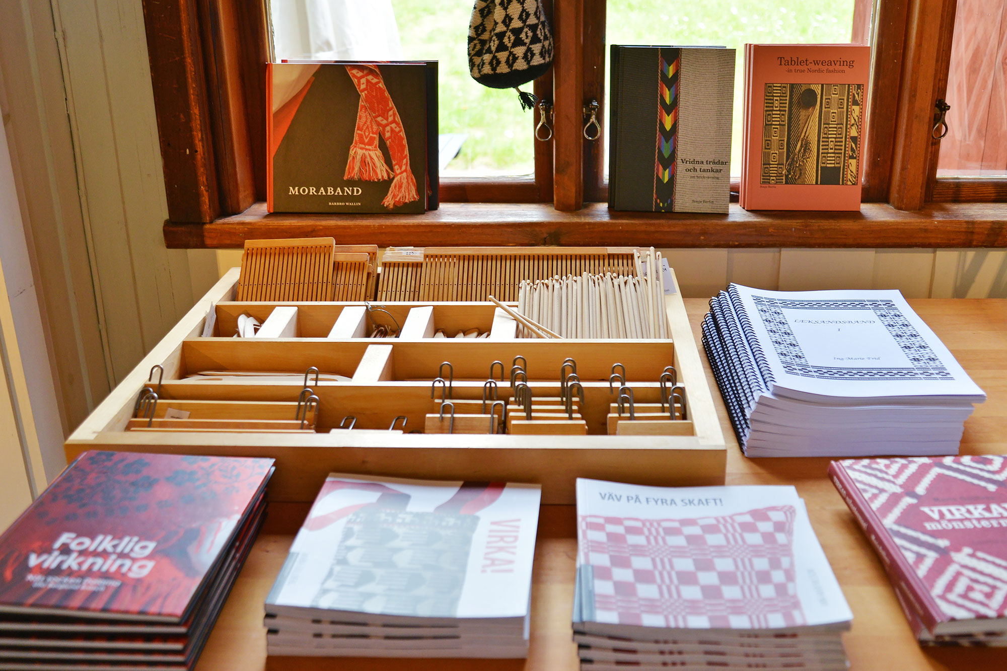 さまざまな織りのパターンは何世紀にもわたる伝統があります。スウェーデンの民族衣装の織物などを昔ながらの方法で復活させたインショーンス・ヴェーヴェリー。ショップには、ダーラナのレクサンド〈Leksand〉地方の伝統的なリネンの布やテーブルクロス、テーブルランナーが並びます。