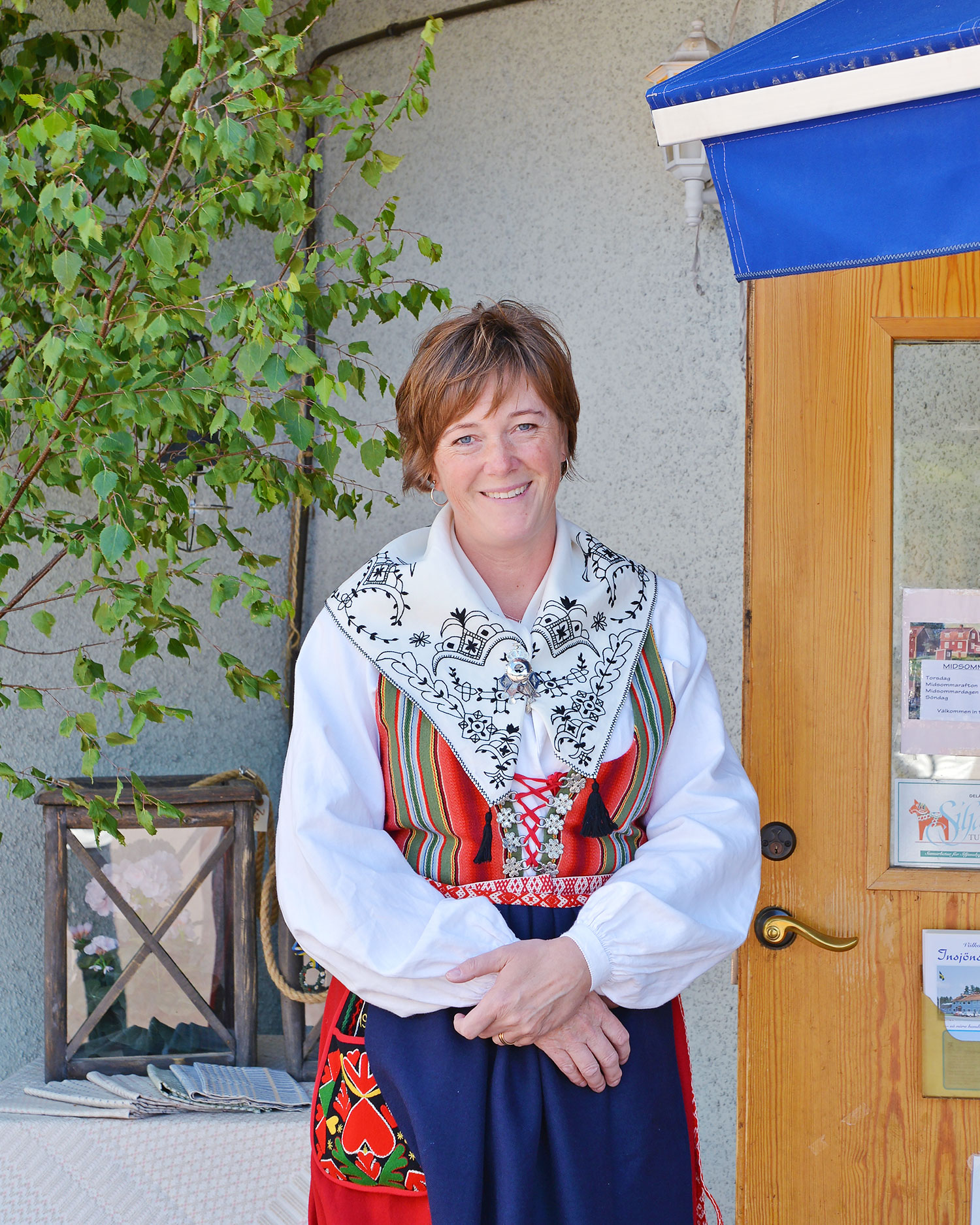 夏至祭前日なので、インショーンス・ヴェーヴェリーのスタッフの女性が華やかなダーラナの民族衣装を着てお出迎えしてくれました!