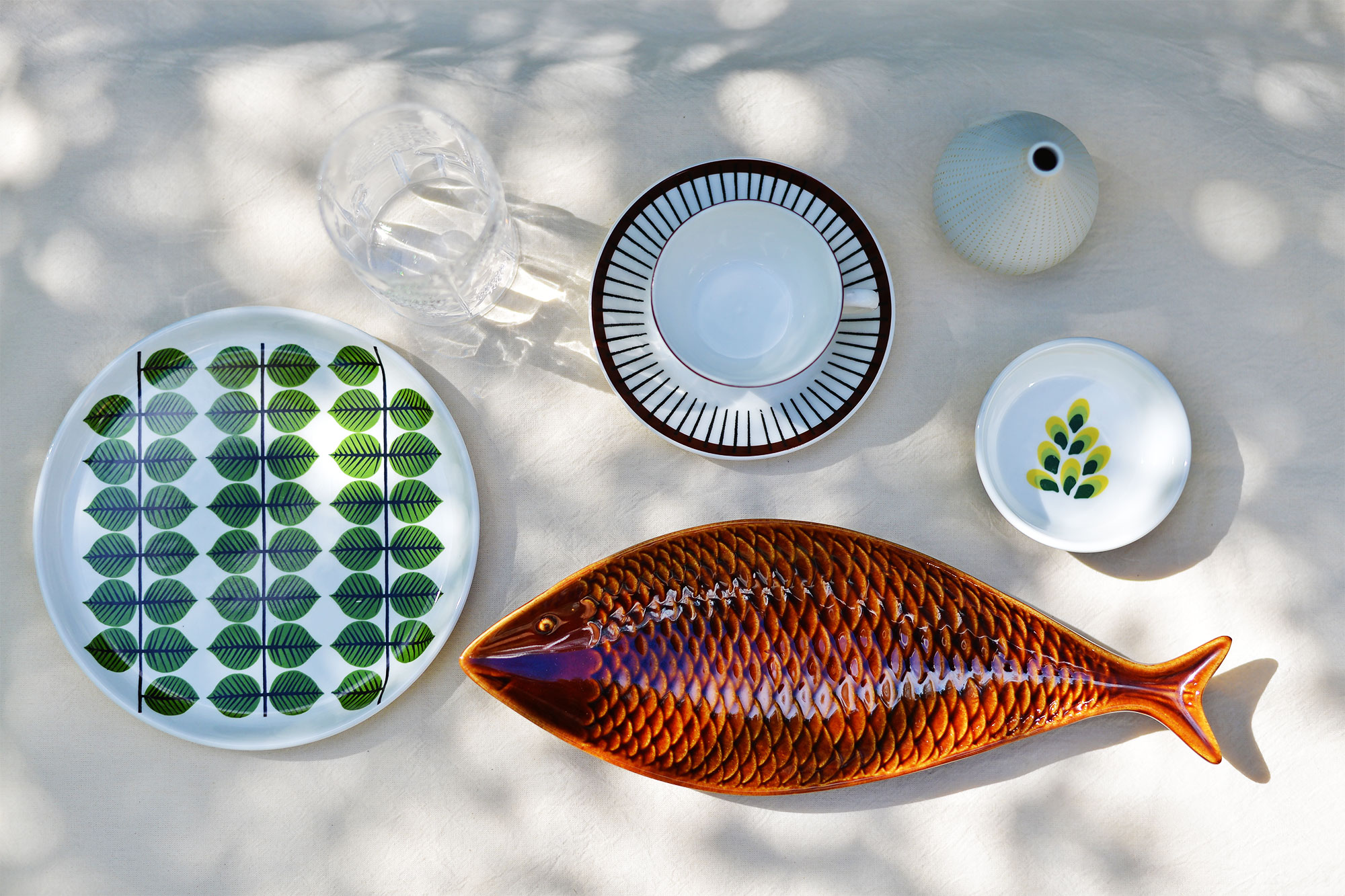 北欧ヴィンテージの食器は少しづつ集めていきました。昔の旅日記に、いつかリンドベリの葉っぱの〈ベルサ〉や、ショコラカラーのスティック柄の〈スピサ・リブ〉のカップでコーヒーを飲みたい!とつづったのですが、今は願いが叶いましたね。リンドベリも大好きなデザイナーで、憧れだったグスタフスベリの北欧ヴィンテージもいくつかあります。