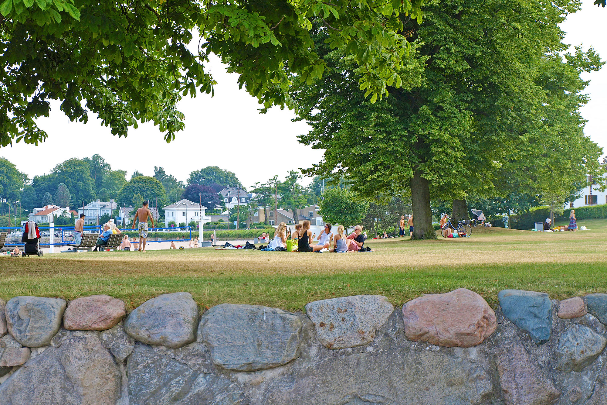ビーチでは海水浴よりも、日向ぼっこや、芝生の上でランチしている家族や学生が多かったです。海で遊ぶのは子供たち。大人は開放的な海の景色を楽しみながら、太陽の日差しをいっぱいに浴びて、短い夏を感じています。