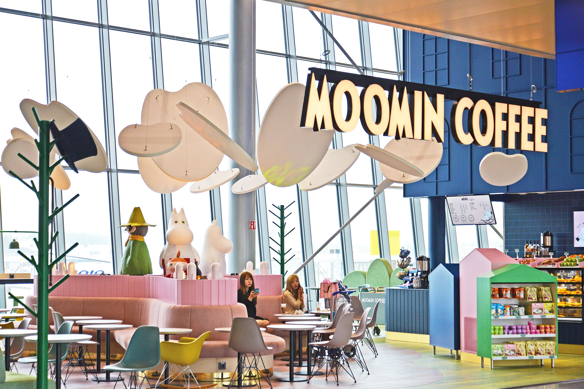 2019年にヘルシンキ・ヴァンター空港内にムーミンカフェ〈MOOMIN COFFEE〉がオープンしました!かわいくてメルヘンなカフェで、ムーミンとスノークのおじょうさん、ミーとスナフキン、ニョロニョロたちがお出迎えしてくれるよ!