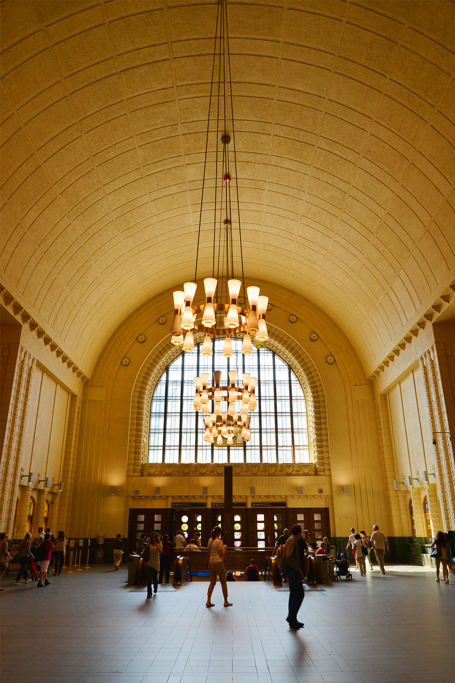 エリエル・サーリネン〈Eliel Saarinen〉が設計し、1919年に完成したヘルシンキ中央駅〈Helsingin rautatieasema〉は高さ48.5mの時計塔が印象的。駅の外装はフィンランド産の花崗岩で造られていて、アーチ型の正面入口には左右2体づつ、ランプを持った像が鎮座しています。 中に入ると、アーチ型の窓から琥珀色の光が差し込んで、駅舎と人のシルエットがとてもきれいでした。
