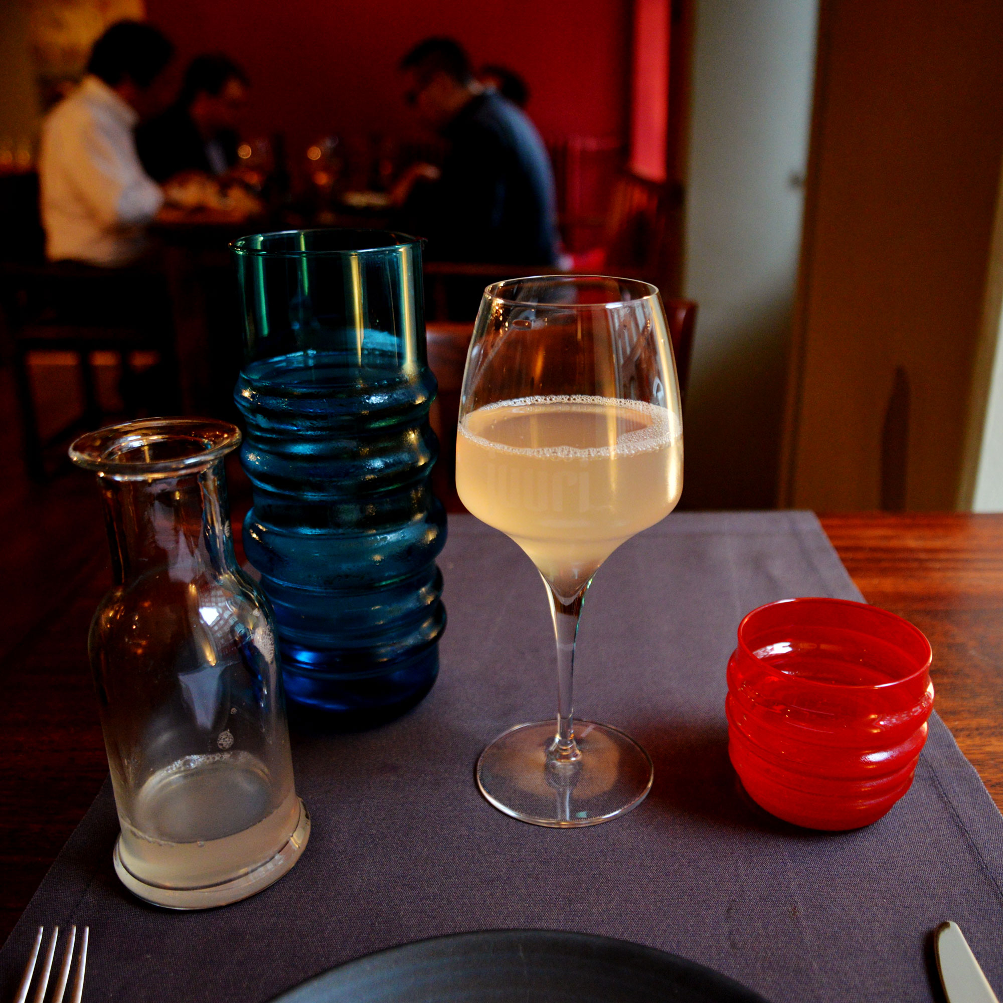 赤いソックスロールドダウンのマリメッコのタンブラーが、キャンドルのようでできれい。旬のルバーブジュースを飲みながら、サパスのおいしいひとときが始まります。
