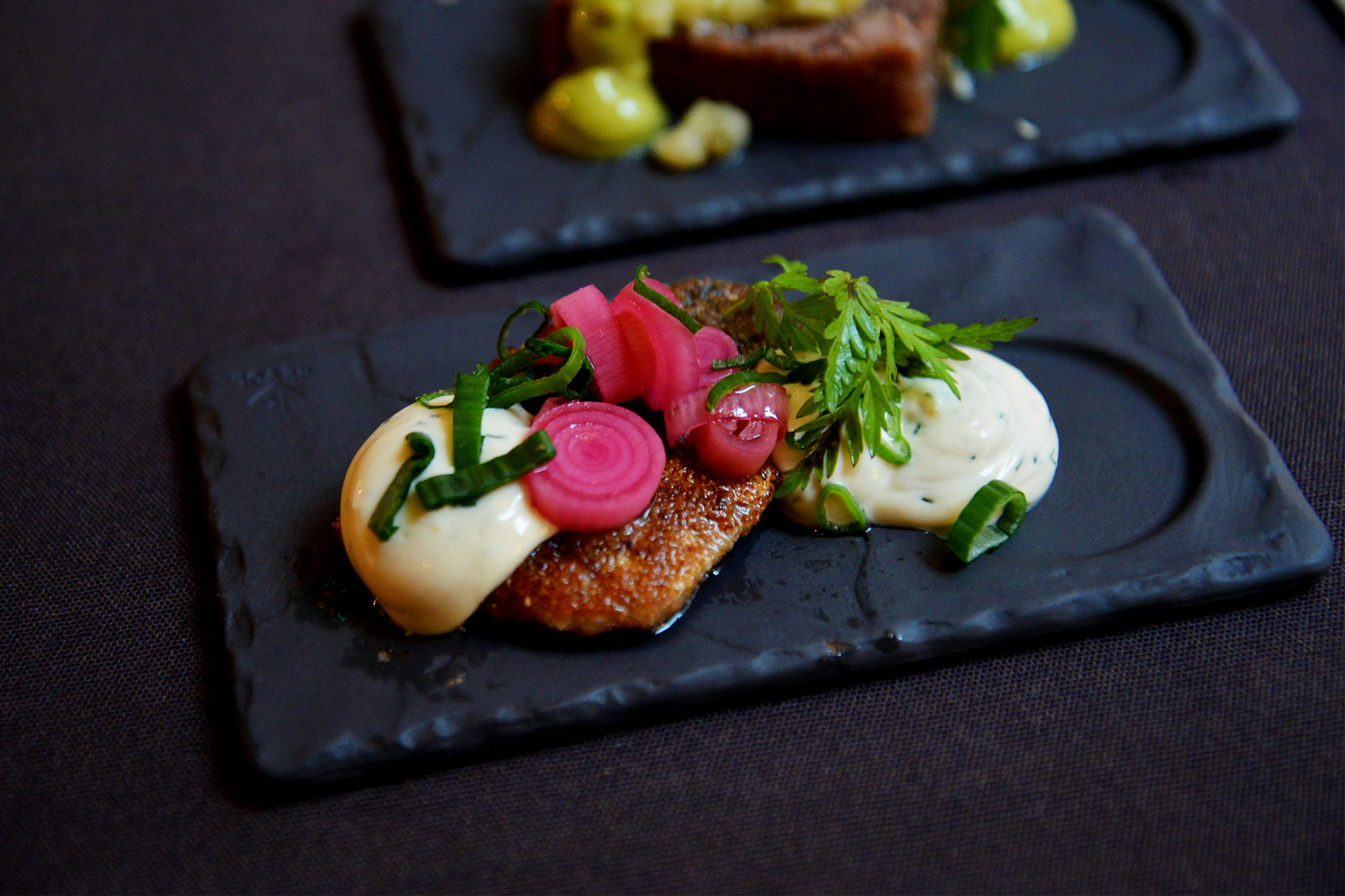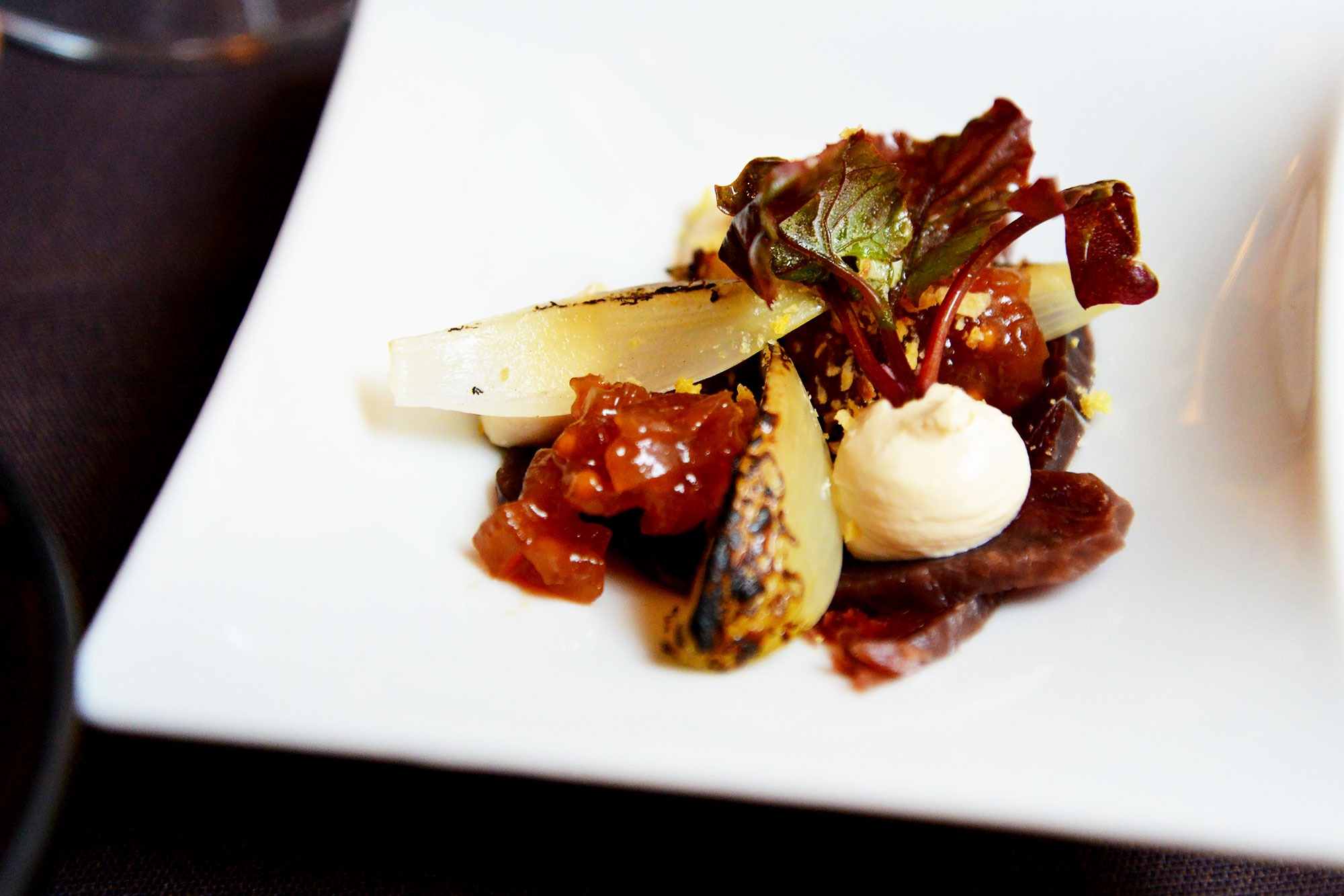 この日のディナーは、お腹がいっぱいになるまでおすすめのサパス(1皿)をオーダー。卵とコールドスモークのニジマス。赤タマネギとボスニア海のニシン。茎のマヨネーズとフィンランド牛……小皿に盛り付けられたサパスは、もうどれも美しくて、感動するほど美味しい! !