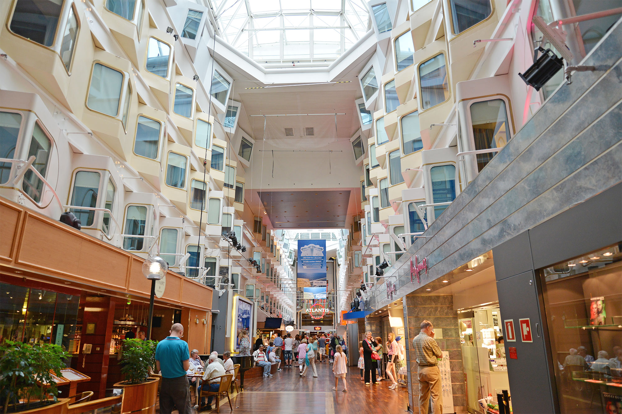 12階あるシリア・セレナーデ号の船内に入ると、そこは7階のメインデッキ。全長142m、高さ最大18mの吹き抜けのプロムナードが広がっています。プロムナードは、ショッピング・レストランアーケードとなっていて、いつも賑やか。ここではショーやパフォーマンスも開催されるそうです。ファッションやトレンドショップ、レストランやカフェ、パブやナイトクラブ、子供が遊べるチルドレン・アクティビティ・センターもあり、免税店へも行けます。