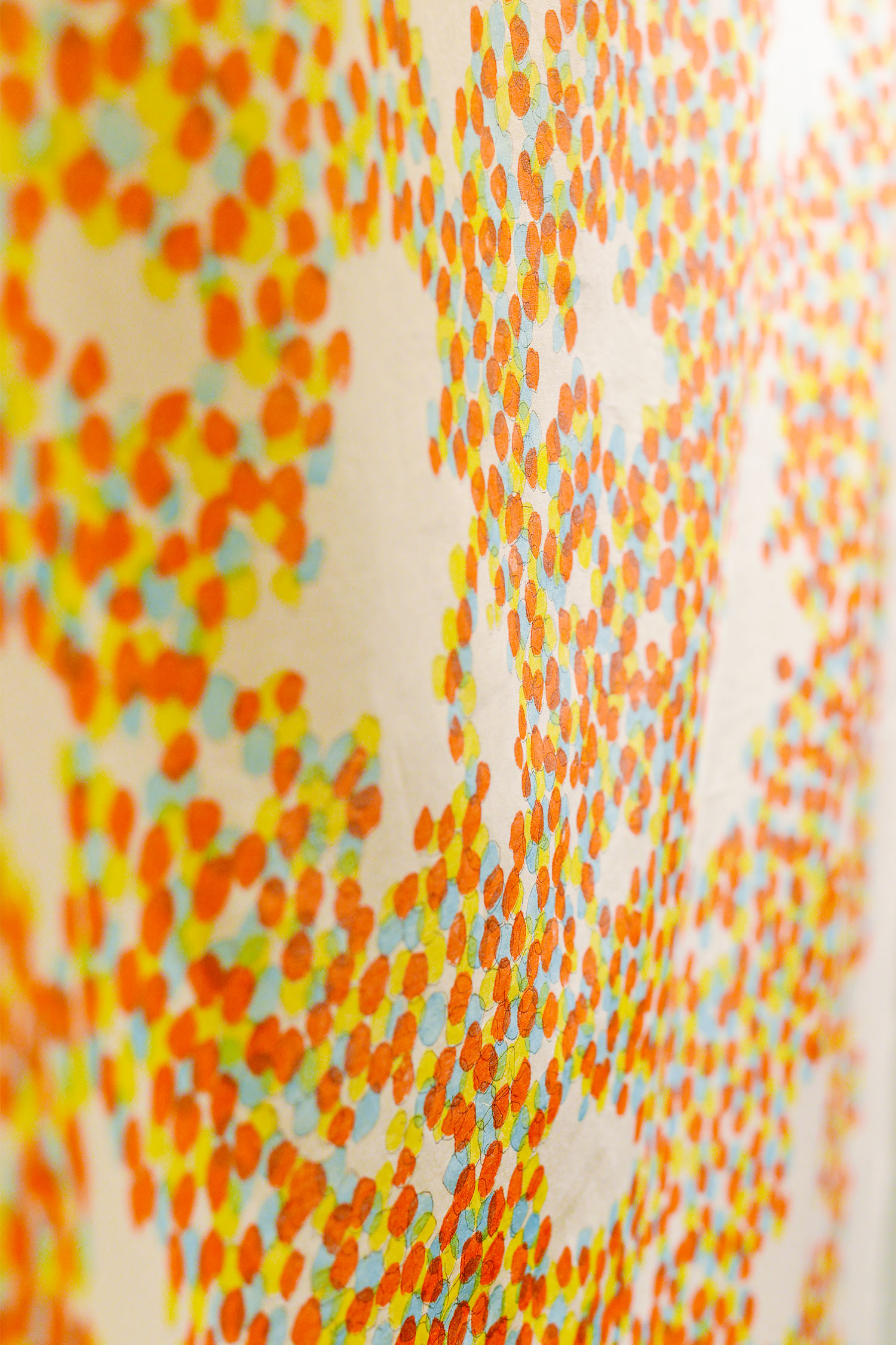 どんなメッセージが込められているのか、わくわくしながら、トレッシングペーパーにプリントされた案内状を広げると、そこには淡い3色の水玉の図案が描かれていました。しかも、同じ紙が2枚入っています。その2枚を重ねて、空に透かしてみます。すると、ゆらゆら揺れる葉っぱからこぼれる日の光のように、色鮮やかな光のしずくが重なって、「こもれび」の景色が広がってきます。