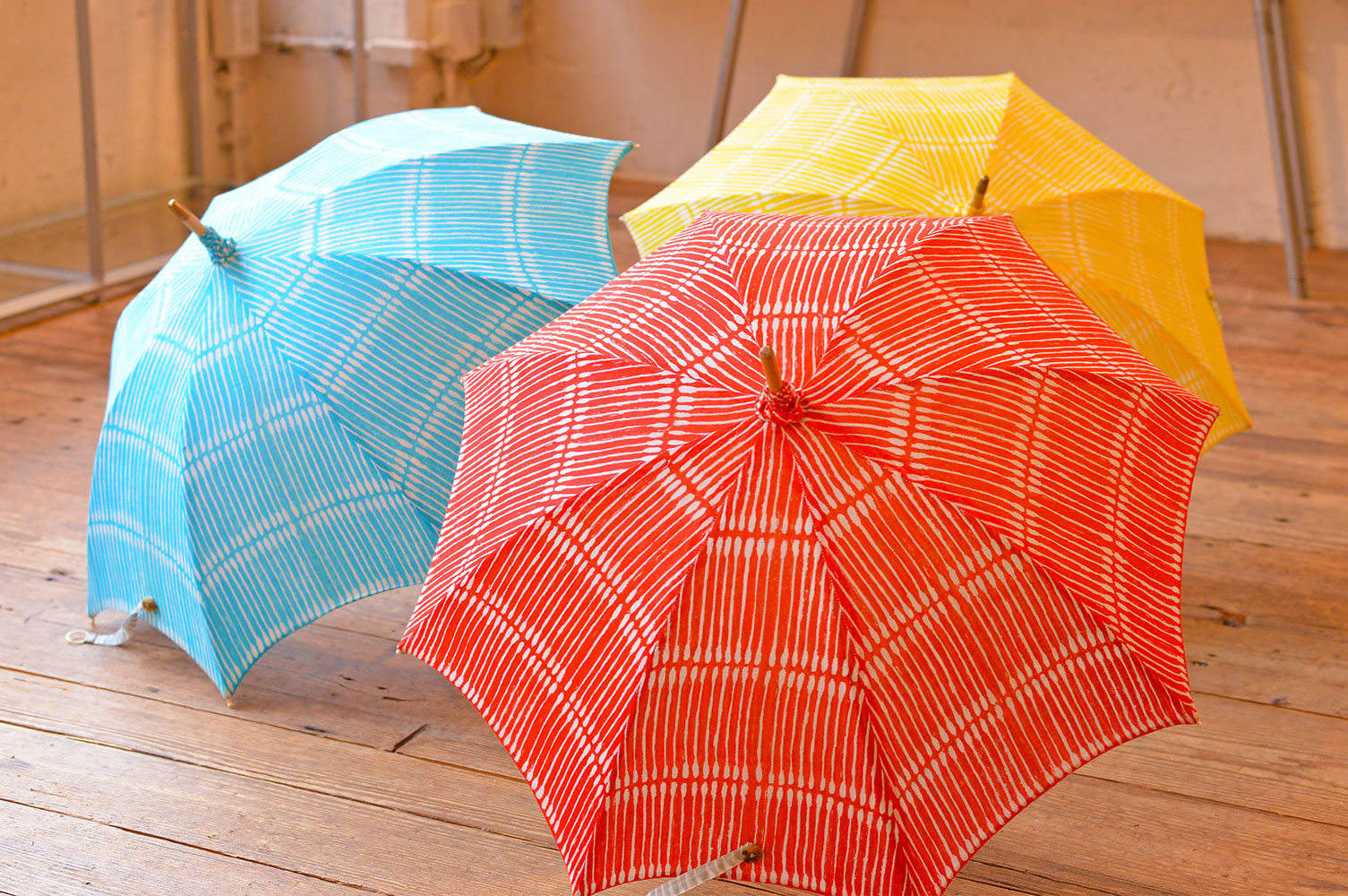 多摩美術大学の染織科でテキスタイルを学んでいたというイイダさん。大学4年のときに自分で染めた布でプロダクトを作ることになり、洋服ではなく、傘を選んだそうです。なぜ「傘」を選んだのか、きっかけはあやふや。でも、妙に傘に愛着がわいてきて。そこから、イイダさんの布づくりと傘づくりの日々が始まったそうです。